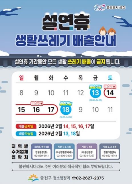 금천구는 설 연휴 기간 생활쓰레기(일반생활쓰레기, 음식물쓰레기, 재활용품) 수거를 일시 중단한다고 밝혔다.청소대행업체 환경미화원들의 휴식권을 보장하고 안전한 근무 환경을 조성하기 위한 조치라고 구는 설명했다.이에 따라 14일부터 17일까지 4일간 생활쓰레기 배출이 금지된다.연휴 기간 중 배출하지 못한 생활쓰레기는 18일 오후 6시부터 배출하면 19일 0시부터 수거할 예정이다.구는 생활쓰레기 배출이 일시 중단됨에 따라 14일부터 18일까지 5일간 주민 불편을 최소화하기 위한 청소상황실과 환경공무관 기동반을 편성·운영하겠다고 밝혔다. 생활쓰레기 관련 민원에 신속히 대응한다는 방침이다.또한 연휴가 끝나는 19일부터 인력과 장비를 총동원해 적체된 생활쓰레기를 일제 수거할 계획이다.유성훈 금천구청장은 “˝평소에 묵묵히 금천의 청결을 책임지고 있는 환경미화원 분들께 감사드린다“라며 ”설 연휴 기간 생활쓰레기 수거를 중단해 불편하시겠지만 많은 이해와 적극적인 참여를 부탁드린다”라고 말했다.
