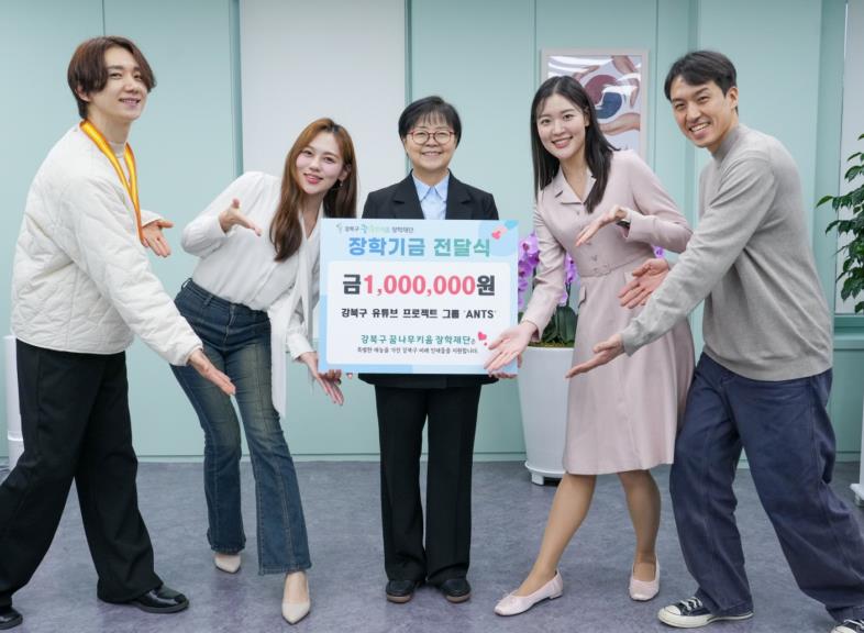 서울 강북구는 지난해 개청 30주년을 기념해 개최된 KBS 전국노래자랑 강북구 편에서 우수상을 수상한 ‘앤츠(ANTS, Always Nine To Six)’가 상금 100만 원 전액을 강북꿈나무키움장학재단에 기부했다고 밝혔다.앤츠는 강북구청 소속 직원과 구 아나운서, 주민으로 구성된 유튜브 프로젝트 그룹이다. 2024년 9월 결성 이후 인공지능(AI)을 활용해 제작한 공익송을 기반으로, 춤과 퍼포먼스를 결합한 콘텐츠를 선보이며 정책과 공익 메시지를 쉽고 흥미롭게 전달해왔다.그동안 ‘쓰레기 빌런’, ‘패싱 보이스피싱’, ‘스톱 더 파이어’ 등 총 17편의 유튜브 콘텐츠를 제작했으며, 이번 전국노래자랑 출연 역시 이러한 참여형 구정홍보 활동의 연장선에서 이루어진 도전이었다.앤츠는 2025년 10월 25일 본선 무대에서 열정적인 퍼포먼스와 완성도 높은 무대로 관객과 심사위원의 호평을 받아 우수상을 수상했다. 해당 방송은 올해 2월 1일 전국에 방영됐으며, 방송 이후 지역사회에서도 큰 관심과 응원이 이어졌다.이에 앤츠 멤버들은 지난 2월 13일 강북꿈나무키움장학재단에 상금 100만 원 전액을 전달했다. 기부금은 지역 내 학생들의 학업과 진로를 지원하는 장학사업에 활용될 예정이다.이번 기부는 수상의 기쁨을 지역사회와 나누겠다는 취지에서 이뤄졌다. 지역을 대표해 무대에 오른 구성원들이 받은 상금을 장학사업에 기탁함으로써, 그 성과를 지역 미래세대 지원으로 연결했다는 점에서 의미가 있다.구 관계자는 “전국 최초의 구립 아이돌이라는 유쾌한 시도가 지역사회 나눔으로 이어졌다는 점에서 매우 뜻깊다”라며 “앞으로도 행정의 공익적 가치를 쉽고 친근하게 전달할 수 있는 콘텐츠를 기획·운영하는 데 최선을 다하겠다”라고 밝혔다.한편, 앤츠는 연말 전국노래자랑 왕중왕전 준비와 함께, 다른 공공기관과의 협업을 통한 공익 메시지를 담은 콘텐츠 제작도 지속해 나갈 계획이다.