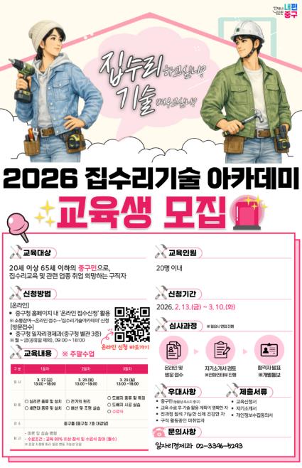 서울 중구가 일상 속 불편을 해결하는 집수리 기술을 배우고, 취업과 창업까지 이어질 수 있도록 돕는 `2026 집수리 기술 아카데미`를 운영한다.노후주택이 많은 구 특성을 반영해, 가정과 현장에서 실제 활용이 많은 집수리 기술 위주로 구성했다. `배워도 막상 못 써먹는 교육`이 되지 않도록 수업시간 대부분을 실습에 할애했다.교육은 다음 달 27일부터 29일까지 3일간 총 15시간 동안 중구청 7층 대강당에서 진행된다. 교육 대상은 20세 이상 65세 이하의 중구민 중 집수리 교육이나 관련 업종 취업을 희망하는 구직자 20명이다. 전문 교육기관에 위탁해 체계적인 커리큘럼으로 운영된다.1일 차에는 실리콘의 종류와 시공법, 세면대 설치 실습을 진행하고, 2일 차에는 전기의 원리 이해부터 배선·조명 교체 실습이 이뤄진다. 3일 차에는 도배지의 종류와 특징을 배우고 실제 도배 시공 실습으로 마무리한다. 구는 교육 이후에도 취업 연계와 사후 관리를 이어간다. 미취업 수료자는 구청 내 일자리플러스센터에 구직 등록 후 전담 상담사를 통해 정기적인 취업 상담과 알선을 지원받게 된다. 향후 심화 과정이나 현장 실습형 프로그램이 운영되면, 이번 교육 수료자에게 우선 참여 기회도 제공할 예정이다.교육 신청은 다음 달 10일까지 가능하다. 중구청 별관 3층 일자리경제과 방문하거나 중구청 홈페이지(소통참여 → 온라인접수신청)를 통해 온라인으로 신청할 수 있다.구 관계자는 “주민들이 생활 속 불편을 직접 해결하고, 더 나아가 취업과 새로운 일자리로까지 이어질 수 있기를 바란다”며 “자원봉사 활동과 사회적 경제기업 조직화 등으로 주민의 배움이 다시 지역으로 환원되는 선순환 구조도 만들겠다”고 밝혔다.