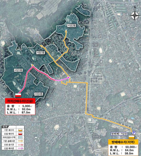 동작구는 까치산(사당동 산32-81, 130번지 일대)에서 사당동 고지대의 수돗물 공급 안정성 강화를 위한 배수지 건설을 진행 중이라고 밝혔다.배수지는 고지대에 설치하는 대형수조로, 정수장에서 생산된 수돗물을 저장하는 시설이다. 지형의 높이차를 이용해 자연 수압을 형성함으로써 별도의 전력 없이도 각 가정에 안정적으로 물을 공급할 수 있다.현재 서울시 전체의 약 96% 지역은 배수지 자연낙차 방식으로 수돗물을 공급받고 있는 반면, 나머지 4%에 속한 사당2~5동은 지금까지도 방배배수지에서 펌프를 활용한 급수방식에 의존해오고 있다.이로 인해 사용량이 급증하는 시간대에는 수압이 낮아지고, 정전·누수 등 사고 발생 시 단수가 불가피해 주민 불편이 지속됐다.구는 사당동 일대가 재개발‧재건축 등 도시정비사업으로 인해 향후 급격한 인구 증가가 예상되는 만큼, 사전에 미리 까치산배수지 건설 사업을 추진하고 있는 것이다.이번에 조성되는 배수지는 총 5,000톤 규모로, 2028년 완공 시 1만 7천여 세대의 수돗물 공급 방식이 전환돼 ▲물 부족 사태 대비 ▲고지대 저수압 문제 해결 ▲정전‧송수관로 파손 시 12시간 이상 비상급수 등 안정적인 급수 체계를 유지할 수 있을 것으로 보인다.한편, 구는 대규모 건설 공사가 지역 생활환경과 녹지 이용에 영향을 줄 수 있는 만큼, 공정 전반에 대한 주민 안내를 강화하고 불편 최소화에 만전을 기할 방침이다.박일하 동작구청장은 “안정적인 급수는 주민 일상과 직결되는 매우 중요한 사안”라며 “까치산배수지 건설을 통해 사당동 주민들이 안심하고 물을 사용할 수 있도록 적극 노력하겠다”라고 말했다.