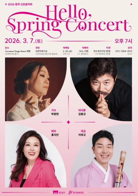 동작구가 2026년 동작 신춘음악회 ‘헬로, 스프링 콘서트(Hello, Spring Concert)’를 개최한다고 밝혔다.동작문화재단이 주최하는 이번 공연은 새로운 계절의 시작을 알리는 봄맞이 음악회로, 대중가요, 성악, 국악 등 다양한 장르를 통해 봄의 설렘과 생동감을 전한다.신춘음악회에는 ▲가수 박정현 ▲성악가 김동규 ▲뮤지컬 배우 홍지민 ▲대금연주자 이복규가 출연해 진정성 있는 무대로 감동을 선사할 예정이다.공연은 3월 7일 토요일 오후 7시부터 9시까지 동작역 5번 출구에 위치한 동작주차공원 빅텐트 ‘컨버스 스테이지 아레나 여명(Converse Stage Arena 여명)’에서 열린다.관람 대상은 초등학생 이상(2019년생 포함 이전 출생자)이며, 관람료는 동작구민 1만 원, 타 지역주민 5만 원으로 전석 동일하다.예매는 오늘(20일) 오후 2시부터 약 800석 매진 시까지 NOL티켓(구 인터파크)을 통해 1인 2매까지 구매 가능하다.박일하 동작구청장은 “동작 신춘음악회를 통해 추웠던 겨울을 뒤로 하고 따뜻한 봄의 설렘을 나누고자 한다”라며, “대중가요부터 성악, 뮤지컬, 국악까지 다채로운 무대를 준비한 만큼, 이번 음악회가 일상에 활력을 더하는 선물같은 시간이 되길 바란다”라고 말했다.
