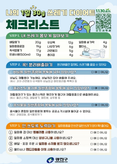 광진구가 구민과 함께하는 생활폐기물 감량 실천운동 ‘1.1.30.쓰다(쓰레기 다이어트)’ 확산을 위해 일일 체크리스트를 제작·배부한다. ‘1·1·30 쓰다’는 한 사람이 하루 30g의 쓰레기를 줄이자는 의미로, 수도권매립지 생활폐기물 직매립 금지에 선제적으로 대응해 지속 가능한 자원순환 도시를 만들기 위한 실천 캠페인이다. 구민 1인이 참여시 연간 약 11kg 감량 효과가 발생하며, 전 구민이 함께하면 수천 톤 규모의 폐기물 감량이 기대된다. 구는 2020년부터 재활용 활성화와 분리배출 홍보 강화 등 다양한 쓰레기 감량 정책을 추진해 왔으며, 그 결과 지난해까지 생활폐기물 9.5%, 약 3,491톤을 줄이는 성과를 거뒀다. 올해는 감량 목표를 더욱 구체화해 ‘하루 30g 줄이기’ 운동을 본격 추진한다. 구민 실천을 돕기 위해 제작한 ‘나의 1일 30g 쓰레기 다이어트 체크리스트’에는 ▲쓰레기별 무게 ▲재활용이 어려운 품목 줄이기 방법 ▲올바른 분리배출 요령 등 감량 행동 수칙을 담았다. 특히, 배달용기와 일회용 컵, 물티슈, 비닐봉지 등 생활 속 쓰레기 무게를 직관적으로 안내해 구민이 자신의 배출 습관을 점검할 수 있도록 구성했다. 텀블러 사용하기, 과대포장 제품 피하기, 음식물 남기지 않기 등 구체적인 실천 항목을 점검하며 쉽고 재미있게 참여할 수 있다. 또한 구는 광진미래기술체험관과 각 동주민센터 등 주요 시설에 ‘쓰레기 몸무게 재기’ 체험 공간과 분리배출 안내 홍보부스를 설치한다. 주민들이 쓰레기 무게를 직접 확인하며 감량 필요성을 체감하고, 올바른 분리배출 실천으로 이어질 수 있도록 운영한다. 아울러, 1인 가구와 유학생, 공동주택 등의 생활 특성을 반영한 맞춤형 분리배출 지원을 실시한다. 재활용 활성화 사업과 다회용기 사용 확대 정책을 함께 추진해 감량 효과를 높이고 생활 속 자원순환을 확산할 계획이다. 김경호 광진구청장은 “하루 30g 줄이기는 작은 실천이지만, 광진구민 모두가 함께하면 큰 변화를 만들 수 있다”며, “구민 여러분의 적극적인 참여를 당부드리며, 앞으로도 쉽고 재미있게 참여할 수 있도록 다양한 홍보와 체험 프로그램을 지속적으로 확대해 나가겠다”고 밝혔다.