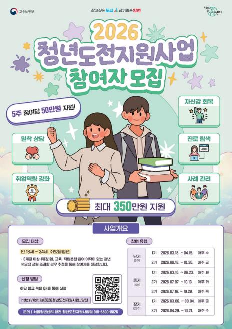 양천구는 구직을 단념한 청년을 대상으로 맞춤형 프로그램을 제공해 자신감 회복과 사회 진출을 돕는 ‘2026년 청년도전지원사업’을 3월부터 본격 추진한다고 밝혔다.올해는 지원 규모를 지난해보다 10명 확대해 총 130명을 기수별로 모집하며, 모집인원의 30%를 ‘지역특화청년’으로 우선 선발해 구민의 참여 기회를 확대할 계획이다.사업 대상은 신청일 기준 6개월 이상 취업·창업·교육·직업훈련 이력이 없는 18~34세 구직단념 청년과 자립준비 청년, 청소년복지지설 입·퇴소 청년, 북한이탈 청년 등 취약계층 청년이다.프로그램은 단기(5주), 중기(15주), 장기(25주) 등 3개 과정으로 나누어 운영하며, △밀착 상담 △사례 관리 △자신감 회복 △진로 탐색 △취업 역량강화 교육을 기본으로 자기이해 프로그램, 현직자 멘토링, 직업기초능력 향상 교육, 면접 스킬 교육 등 실질적인 취업 준비 과정이 포함된다. 특히 장기 과정은 총 200시간 규모의 집중 프로그램으로 지역 취업 현장 체험 활동, 공모전, 취·창업 박람회 참석 등 맞춤형 심층 지원을 제공한다.또 6개월 이상 구직을 단념하며 위축되고 불안정해진 심리적·신체적 상태를 회복할 수 있도록 △심리상담 △건강진단 △체력관리 △커뮤니케이션 교육 등 다양한 프로그램도 함께 운영해 청년의 자신감 향상을 돕는다.참여 청년에게는 5주마다 50만 원의 참여 수당이 지급되며, 프로그램 이수와 구직활동, 취업 성공에 따른 추가 인센티브를 포함해 최대 350만 원까지 지원한다. 프로그램 종료 후에는 국민취업지원제도, 직업훈련, 일경험 사업 등과 연계해 지속적인 사후관리도 이어갈 예정이다.한편, 양천구는 고용노동부가 주관하는 ‘2025년 청년도전지원사업’ 평가에서 운영 성과를 인정받아 ‘우수기관’으로 선정됐다. 지난해 지원 목표 120명 대비 126명이 참여해 105%의 참여율을 기록했으며, 이수율은 92%에 달했다. 이 가운데 23명이 취·창업에 성공했고, 국민취업지원제도 26명, 직업훈련 13명, 일경험 사업 4명을 연계해 취업 지원을 이어갔다. 특히 전체 이수자 중 62%(72명)가 양천구 청년으로, 지역 청년의 재도전을 적극 지원했다는 평가를 받았다.이기재 양천구청장은 “반복되는 취업 실패의 좌절과 경제적 어려움 등으로 구직을 단념한 청년들이 다시 사회와 연결되어 자신의 가능성을 펼칠 수 있도록 지원을 아끼지 않겠다”며 “청년들의 도전을 응원하는 이번 사업에 많은 관심과 참여를 바란다”고 말했다.