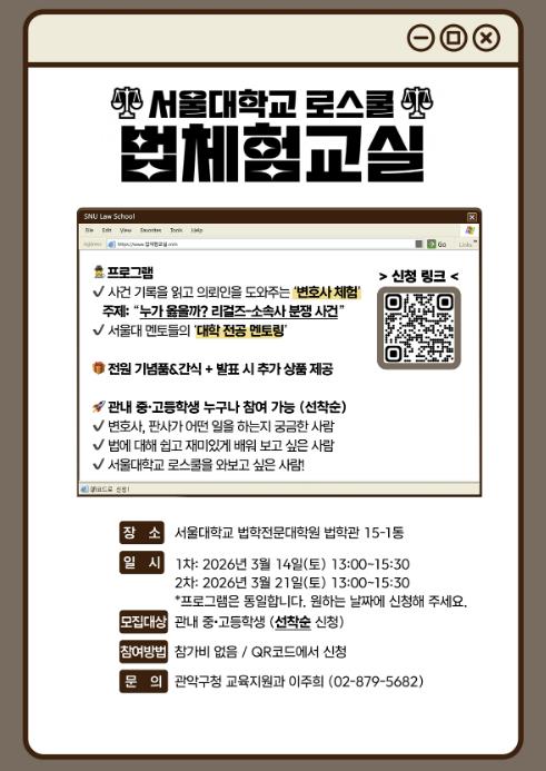 관악구가 서울대학교 법학전문대학원 봉사동아리 프로보노와 함께 법체험 멘토링 ‘관악탐정단:진실을 찾아서’를 개최한다.‘관악탐정단:진실을 찾아서’ 멘토링 프로그램은 서울대 법학전문대학원 학생들이 관내 중‧고등학생들에게 법학 분야의 이해를 돕고, 진로‧진학 정보를 제공하는 재능기부 프로그램이다.지난 2025년도에는 총 3회에 걸쳐 176명의 멘토와 멘티가 참여하는 등 매년 참여 학생들로부터 큰 호응을 얻고 있다.올해 상반기 프로그램은 ‘위기의 걸그룹 리걸즈, 그들은 대표님과 함께할 수 있을까?’라는 가상의 사건을 주제로 설정했다. 참가 학생들은 민사소송과 민사상 계약의 기초 이론을 배운 뒤, 소장 작성과 모의재판 등 실습을 통해 법조인의 직무를 생생하게 체험하게 된다.특히 ▲이론수업 및 퀴즈 ▲조별 토론 및 발표 ▲진로‧진학 강연 등 청소년 멘티들의 눈높이에 맞춘 다양한 프로그램을 마련해 학습 효과를 높일 계획이다.이번 법체험 교실은 3월 14일과 21일 두 차례 서울대학교 법학전문대학원에서 운영된다. 참여를 희망하는 관내 중‧고등학생은 오는 3월 3일부터 10일까지 홍보 포스터의 QR코드를 통해 개별 신청하면 된다.박준희 구청장은 “이번 멘토링이 관내 청소년들에게 법에 대한 문턱을 낮추고, 사회적 책임감을 갖춘 민주시민으로 성장하는 소중한 발판이 되길 기대한다”라고 말했다.