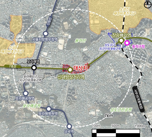 서울시는 2026년 2월 24일 개최한 제3차 도시·건축공동위원회에서 `신대방지구 지구단위계획구역 및 계획 결정(변경)(안)`을 ‘수정가결’ 했다고 밝혔다. 대상지는 지하철 신대방삼거리역(7호선) 일대로, 서측으로는 보라매역(7호선·신림선), 동측으로는 장승배기역(7호선·서부선(예정))이 위치하고 있어 광역교통의 중간적 요충지로서 위상과 기능이 강화되고 있는 지역이다. 이번 지구단위계획 재정비는 2014년 이후 변화된 지역 여건에 대응하여 신대방 지구 중심 위상에 적합한 건축물의 개발 여건을 마련하고, 증가하는 역세권 유동인구를 고려하여 저층부 가로활성화 용도 도입 및 보행환경 개선을 위해 추진됐다. 지구단위계획 변경(안)에는 △지구단위계획 용적률 체계 개편(근린상업지역 300% → 600%, 준주거지역 250% → 400%) △최고높이 완화(근린상업지역 70m → 100m, 준주거지역 40m → 90m) △기계획됐으나 실현이 어려운 공공보행통로, 벽면한계선 삭제 △공동개발 지정·권장 축소 △최대개발규모 폐지 등의 내용이 반영됐다. 규제적 성격의 요소는 최소한으로 하여 역세권 일대의 개발 여건을 마련하고 지역활성화를 유도하고자 한다. 안대희 서울시 도시공간본부장은 “신대방지구 지구단위계획 변경을 통해 역세권의 상업·업무 복합 기능과 지구 중심 위상을 강화하여 도시에 활력을 불어넣을 것으로 기대한다.”고 말했다.