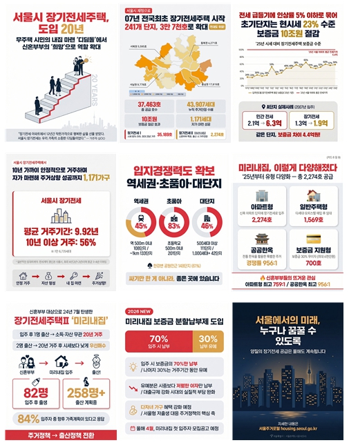 서울 대표 주거사다리 ‘장기전세주택’의 입주자들은 작년 한 해만 보증금 약 10조 원을 절감한 것으로 나타났다. 또 지난 2024년 도입된 장기전세주택Ⅱ ‘미리내집’ 입주자 설문 결과, 응답자의 84%가 ‘향후 가족계획이 있다’고 답해 ‘저출생 극복’이라는 정책 취지에도 발맞춰 가고 있는 것으로 조사됐다. 서울시는 ‘장기전세주택’의 그간 공급 성과와 정책 효과를 종합 분석한 결과를 3일 발표했다. 2007년 전국 최초로 도입된 장기전세주택은 현재도 서울에서만 운영되고 있는 ‘서울시만의 특별한 주거사다리’ 정책으로 국비 지원 없이 100% 시 재정으로 공급된다. ‘장기전세주택’은 무주택 시민에게 장기간 안정적인 거주 환경을 제공하며 2007년부터 현재까지 241개 단지, 총 37,463호를 공급해 왔다. 지난 2024년에는 신혼부부에 특화된 ‘미리내집(장기전세주택Ⅱ)’을 새롭게 도입해 저출생 대응 주거정책으로 기능을 확대하고 있다. 현재 거주 중인 세대를 포함해 지금까지 총 43,907가구에 안정적인 주거를 제공했다. 장기전세주택은 인근 전세 시세의 80% 이하 수준으로 공급되며, 2년 단위 재계약을 통해 최장 20년까지 거주할 수 있어 무주택 시민이 장기간 집 걱정 없이 거주할 수 있도록 설계됐다. 현재 거주 중인 세대를 포함하여 그간 총 43,907세대에게 이러한 안정적인 거주환경을 제공해 오고 있다. ‘보증금 인상률’도 연평균 5% 수준으로 민간 대비 매우 낮게 유지됐다. 민간과의 격차는 갈수록 확대되는 구조로, 2025년 기준 장기전세주택 평균 보증금은 서울 아파트 평균 전세가격의 54% 수준이다. 임대료 상승기에 장기전세주택이 시민 주거 안정 역할을 충실히 수행해 온 것이다. 특히 제도가 도입된 2007년 입주자들은 현재 시세 대비 23% 수준의 보증금으로 장기전세주택에 거주하고 있는 것으로 나타났다. 입주연도별 장기전세주택 거주자들의 보증금 절감 규모를 합산하면 ‘작년 한 해’ 동안의 보증금 절감 규모는 10조 원에 달했다. 작년 기준으로 입주연도별 거주자들의 평균 보증금과 서울 아파트 평균 전세가격의 차이에 세대 수를 곱해 계산한 결과다. 또한 현재 거주 세대의 ‘평균 거주기간’은 9.92년으로, 일반적인 임대차계약 기간이 최장 4년(2년+2년)인데 비하면 2배 이상 오랜 기간 거주한 것으로 나타났다. 10년 이상 거주한 가구도 56% (16,735세대)에 달하는 것으로 조사됐다. 뿐만 아니라 입주민의 상당수가 거주기간 동안 주거비 절감을 통해 마련한 자산으로 자가(自家)로 ‘주거 상향에 성공’한 것으로 확인돼 장기전세주택이 본연의 취지인 주거 사다리 역할을 제대로 수행하고 있는 것으로 확인됐다. 장기전세주택에 거주하다 퇴거한 14,902세대 중 그간 자가를 마련하여 퇴거한 세대수는 1,171세대(8%)에 달했으며, 평균 거주기간은 9년 5개월이었다. 많은 장기전세주택이 역세권·초품아·대규모 단지 아파트 등 시민이 선호하는 교통 및 생활 인프라, 편리하고 쾌적한 생활환경 등 우수한 입지에 공급돼 입주민 삶의 질 향상에 기여한 것으로도 나타났다. 지하철역 반경 500미터 이내, 도보 7분 이내 지하철역 접근 가능한 ‘역세권 장기전세주택’은 전체 241개 단지 중 45%(108개 단지), 강변북로·올림픽대로 등 교통이 편리하고 한강변 조망, 녹지·한강공원 등을 이용할 수 있는 한강벨트 위치 단지는 61%(148개 단지)에 이르렀다. 나머지 133개 단지 역시 버스정류장에 인접하거나 지하철역 1km 이내 위치하는 등 대중교통 연계성이 좋은 입지에 공급돼 입주자 편의성, 생활 만족도가 높은 것으로 나타났다. ‘초품아(초등학교를 품은 아파트) 장기전세주택’은 전체의 83%(201개 단지)로 단지 모두 초등학교 반경 500m 이내에 위치해 안전하고 편리한 통학을 보장, 신혼부부를 비롯한 학령기 자녀를 키우는 가구의 만족도가 높게 나타나고 있다. 특히 2024년 강동구에 공급된 A단지는 도보권 내 초등학교 2개가 위치하고 있어 대표적인 양육 친화형 장기전세주택(미리내집) 단지로 손꼽히고 있다. 다양한 커뮤니티 시설과 풍부한 상권, 넓은 산책로 등이 제공되는 500세대 이상 ‘대단지 장기전세주택’은 전체의 46%인 111개 단지, 1,000세대 이상은 42개 단지(17%)에 달한다. 서울시는 저출생 극복을 위한 대책으로 신혼부부 대상 장기전세주택Ⅱ ‘미리내집’을 공급 중이다. 2024년 7월 첫 입주자 모집공고 이후 현재까지 총 2,274호를 공급했으며, 올해 1월 말 기준 1,018명이 입주했다. ‘미리내집’은 입주 이후 자녀를 1명만 출산하더라도 소득·자산 증가와 관계없이 20년간 거주할 수 있고, 2자녀 이상 출산할 경우 20년 거주 후 시세보다 저렴한 가격으로 주택 우선 매수 자격이 주어지는 등 출산 인센티브가 제공된다. 지난해부터는 기존에 공급해 오던 ‘아파트형 미리내집’뿐만 아니라 한옥을 포함한 일반주택형, 민간임대주택에 대한 보증금 지원형 등 유형을 다양화하여 신혼부부 선택의 폭을 한층 넓혔다. ‘비아파트 매입’을 통한 일반주택형은 최고 경쟁률 114대 1(평균 51.6대 1), ‘공공한옥’은 최고 956대 1(평균 299대 1)을 기록하기도 했다. 일반주택형은 다세대·오피스텔 등 비아파트를 매입