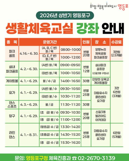 영등포구가 구민의 건강 증진과 생활체육 활성화를 위해 올해 상반기 생활체육 교실 참여자를 모집한다고 밝혔다.이번 상반기 생활체육 교실은 파크골프, 실내 파크골프, 게이트볼, 요가, 댄스스포츠, 라인댄스, 당구 등 7개 종목, 총 17개 교실로 운영된다. 구는 구민들의 다양한 생활체육 수요를 반영해 종목을 구성했다.특히 올해 구는 파크골프에 대한 구민들의 높은 관심을 반영해 ‘실내 파크골프 교실’을 신설했다. 수업은 영등포구 실내 파크골프장 3호점(신길3동 구청사)에서 진행되며, 날씨에 영향을 받지 않는 실내 공간에서 보다 쾌적하고 안전하게 파크골프를 배울 수 있도록 했다.수업은 4월부터 약 3개월간 운영한다. 반별 모집 인원은 20명 내외이며, 교육 장소는 종목별로 다르다. 신청은 파크골프 종목이 3월 9일까지, 실내 파크골프를 포함한 그 외 종목은 3월 12일부터 3월 18일까지 받는다.참여를 희망하는 구민은 서울시 공공서비스예약 누리집 ‘교육강좌’ 게시판을 통해 온라인으로 신청하거나, 신청 기간 내 구청 본관 5층 체육진흥과를 방문해 접수하면 된다.최호권 구청장은 “구민 누구나 가까운 곳에서 편리하게 운동할 수 있도록 생활체육 기반을 더욱 확대하겠다”라며 “구민 수요를 반영한 다양한 프로그램을 마련해 체육활동 참여 기회를 넓혀나가겠다”라고 전했다.