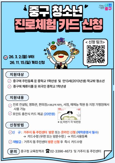 서울 중구가 지역 청소년들의 다양한 진로 탐색과 문화·예술 체험 기회를 확대하기 위해 ‘청소년 진로체험카드’를 지급한다.지원 대상은 중구에 주민등록을 둔 중학교 1학년 학생과 13세 학교 밖 청소년이다. 관내에 체류지를 둔 외국인 청소년도 포함된다. 상·하반기 각 10만 원씩, 연간 최대 20만원이 포인트 카드 형태로 지급된다. 카드는 12월 15일까지 지정 가맹점에서 사용해야 하며, 기간 내 사용하지 않은 포인트는 소멸된다.청소년들은 지급받은 카드를 활용해 진로·직업 체험 프로그램, 문화·예술 활동, 공연·전시 관람, 체육시설 이용, 서점 등 지정 가맹점에서 자유롭게 사용할 수 있다. 가정 형편과 관계없이 누구나 다양한 체험에 참여할 수 있도록 했다.중구가 지난해 9월부터 12월까지 시범 운영한 결과, 진로체험과 상담, 영화·공연·전시 관람, 체육·문화센터, 서점 등에서 총 1,774건(사용률 89%)이 이용되는 등 높은 만족도를 보였다.올해는 신청 절차를 한층 개선했다. 중구청 홈페이지(AI내편중구 홈페이지 ▶ ‘진로체험’ 검색)뿐 아니라 거주지 동 주민센터 방문 신청도 가능하며, 카드 수령 역시 방문과 우편 방식 중 선택할 수 있도록 했다. 상반기에 카드를 발급받으면 별도의 추가 신청 없이 하반기까지 지원금(10만원)을 받을 수 있다. 신청 기간은 11월 15일까지다.또한, 기존 문화·예술 중심에서 나아가 직업체험, 스포츠, 창의·과학 분야 등으로 가맹점을 확대해 청소년 선택의 폭을 넓힐 계획이다. 이를 위해 구는 올해 4월까지 진로·직업·문화체험·스포츠 시설·체험센터·서점 등 관련 온·오프라인 사업체를 대상으로 카드 사용처(가맹점)를 추가 모집한다. 사용처는 진로체험카드 홈페이지에서 확인할 수 있다.구 관계자는 ˝중구는 경제적 여건과 관계없이 모든 아이들이 스스로의 꿈을 찾을 수 있도록 지원하고 있다˝며 ˝진로체험카드가 우리 청소년들에게 더 넓은 세상을 경험하고 미래를 설계하는 든든한 디딤돌이 되길 바란다”고 전했다