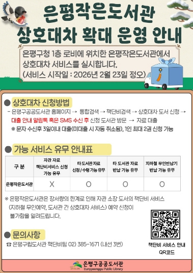 서울 은평구는 은평구 공공도서관 상호대차 서비스 ‘책단비’를 확대 운영한다고 밝혔다.‘책단비’는 이용자가 원하는 자료를 가까운 도서관에서 대출·반납할 수 있는 상호대차 서비스로, 작년 한 해 22만여 권이 대출되는 등 지역 주민에게 꾸준히 이용되고 있다.이번에 은평구청 본관 1층에 위치한 은평작은도서관이 새롭게 참여해 상호대차 참여 도서관은 총 11개관으로 확대됐다. 이에 따라 구청 방문 민원인과 인근 주민의 도서 이용 편의도 높아졌다.서비스 이용을 위해서는 은평구 공공도서관 회원가입이 필요하며, 은평구 공공도서관 누리집 또는 리브로피아 앱을 통해 신청할 수 있다. 대출한 자료는 은평구 공공도서관이나 지하철 무인반납기를 통해 반납할 수 있다.김미경 은평구청장은 “책단비 서비스 확대를 통해 지역 내 도서 접근성을 높이고 생활권 중심의 독서 환경을 강화하겠다”고 말했다.자세한 사항은 은평구립도서관 누리집을 참고하거나 전화로 문의하면 된다.