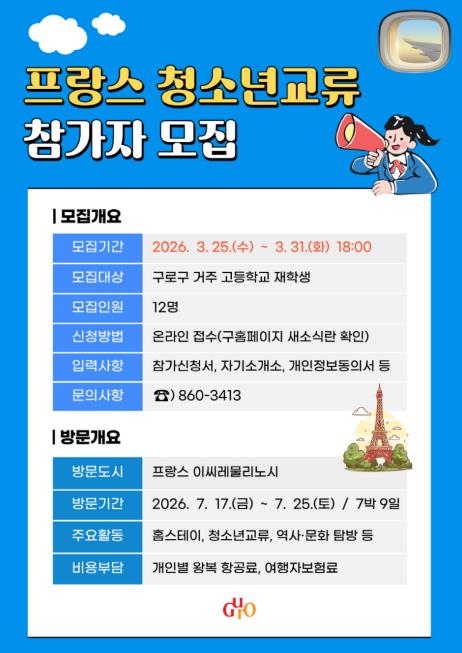구로구가 오는 25일부터 31일까지 프랑스 역사·문화 등을 체험할 수 있는 ‘프랑스 청소년 교류 프로그램’ 참여자를 모집한다.청소년 해외 교류 프로그램은 관내 청소년들에게 해외 역사, 문화 체험 등의 기회를 제공해 글로벌 역량 강화를 도모하고자 마련됐다.구는 구로구에 거주하는 고등학생을 대상으로 1차 서류전형과 2차 면접심사를 거쳐 총 12명의 청소년을 선발한다.선발된 청소년은 7월 17일부터 25일까지 7박 9일 동안 구로구 자매도시인 프랑스 이씨레물리노시를 방문해 현지 가정 체험(홈스테이), 역사·문화를 체험하고 청소년 친교 활동 등을 펼칠 예정이다.비용은 구로구와 이씨레물리노시 청소년 교류 합의에 따라 초청도시인 이씨레물리노시에서 숙식비, 체재비 일체를 부담하고, 참가자는 개인 왕복 항공료와 여행자 보험료를 부담하면 된다.참여를 희망하는 청소년은 이달 25일부터 31일까지 구로구청 누리집에서 온라인으로 신청하면 된다.구로구 관계자는 “이번 교류 프로그램으로 청소년들이 세상을 직접 경험하며 국제적 감각과 소통 역량을 키울 수 있는 소중한 기회가 될 것”이라며 “앞으로도 다양한 해외 교류 프로그램을 통해 청소년들이 세계 무대에서 꿈을 펼칠 수 있도록 최선을 다하겠다”고 말했다.
