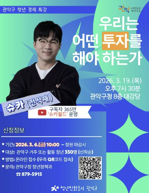 관악구가 오는 3월 19일, 청년들의 경제적 자립을 지원하고 올바른 재테크 가치관 형성을 돕기 위해 인기 경제 유튜버 ‘슈카’를 초청해 특별 강연을 개최한다.`우리는 어떤 투자를 해야 하는가`를 주제로 열리는 이번 특강은 고물가와 저성장 등 급변하고 불안정한 경제 상황 속에서 자산 관리에 어려움을 겪는 청년들의 고민을 해결하고, 건강한 재무 설계의 방향성을 제시하고자 마련됐다.강연자로 나서는 ‘슈카(본명 전석재)’는 365만 구독자를 보유한 유튜브 채널 ‘슈카월드’의 운영자다. 어려운 경제 지식을 특유의 재치 있는 입담과 날카로운 통찰력으로 풀어내 청년층으로부터 절대적인 지지를 얻고 있다.슈카는 이번 강연을 통해 청년들이 마주한 투자 현실을 짚어보고, MZ세대가 지향해야 할 경제 생활에 대해 심도 있는 메시지를 전달할 예정이다.특강은 3월 19일 오후 7시 30분부터 관악구청 8층 대강당에서 열린다. 메인 강연 직후에는 청년들과의 실시간 질의응답(Q&A) 시간이 이어진다. 이를 통해 청년들이 현장에서 느끼는 현실적인 재무 고민을 나누고, 전문가의 생생한 조언을 직접 듣는 소통의 장이 펼쳐질 것으로 기대된다.참여 대상은 관악구에서 거주하거나 활동하는 만 19세부터 39세까지의 청년이다. 모집 인원은 총 350명으로, 오는 3월 6일(금) 오전 10시부터 선착순 접수를 시작한다. 참여를 희망하는 청년은 홍보 포스터의 QR코드를 스캔해 온라인으로 신청하면 된다.박준희 구청장은 “경제적 자립을 꿈꾸는 청년들이 이번 특강을 통해 자신만의 올바른 투자 관점을 정립하고, 미래를 설계할 자신감을 얻길 바란다”라며, “앞으로도 청년들이 실질적으로 체감할 수 있는 다양한 지원책을 마련해 ‘청년친화도시 관악’을 만들어 가겠다”라고 말했다.