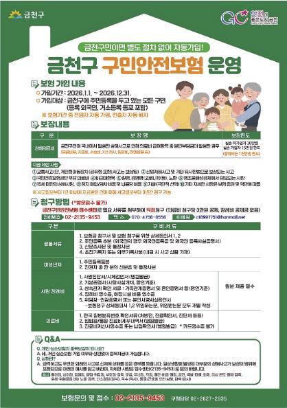 금천구는 2023년 하반기부터 금천구 모든 구민을 대상으로 시행하고 있는 ‘구민안전보험’을 올해부터 일부 보장 기준을 개선해 운영한다고 밝혔다.구민안전보험은 일상생활 중 발생한 상해사고로 의료비가 발생하거나 사망한 경우 보험금을 지원하는 제도다. 금천구에 주민등록이 돼 있는 구민과 등록 외국인, 국내 거소 신고를 한 외국국적동포는 별도의 가입 절차 없이 자동으로 가입된다.올해부터 의료비 지원은 실손 보험 가입 여부에 따라 차등 적용된다. 실손보험 미가입자는 1인당 최대 30만 원, 실손보험 가입자는 최대 15만 원까지 지원한다. 사망 시에는 장례비 최대 1천만 원이 지급된다.금천구 구민안전보험은 사망이나 후유장애 중심으로 운영되는 서울시 시민안전보험과 달리 상해 의료비 중심으로 보장하는 것이 특징이다.보장 대상 상해 유형은 총 20가지로, 넘어짐, 부딪힘, 베임, 떨어짐, 화상, 전동킥보드 사고 등 일상생활에서 발생할 수 있는 다양한 사고가 포함된다.단, 교통사고, 질병, 노환, 감염병 등으로 인해 발생한 의료비·장례비는 보장되지 않는다. 산업재해, 영조물배상 등 다른 제도를 통해 보상받은 경우에도 지급이 제한된다.보험 청구는 사고일로부터 1년 이내 치료받은 건에 대해 신청할 수 있으며, 사고 발생일로부터 3년 이내까지 청구 가능하다. 신청은 구민안전보험 접수센터에 필요 서류한 서류를 제출하면 된다.구 관계자는 “일상생활 중 예상치 못한 사고를 당한 구민들에게 구민안전보험이 실질적인 도움이 되길 바란다”라며, “앞으로도 구민 생활과 밀접한 안전망을 지속적으로 강화해 안전한 금천을 만들어 가겠다”라고 말했다.