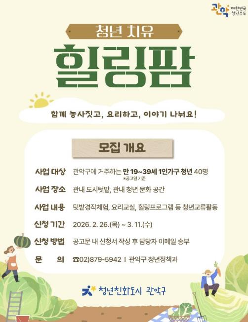 전국 최초 청년친화도시 관악구가 고립·은둔 청년의 신체적·정신적 건강회복을 통한 일상회복과 사회복귀를 돕기 위해 ‘2026년 청년 치유 힐링팜’ 사업 참여자를 모집한다.국무조정실이 발표한 `2024 청년의 삶 실태조사` 결과에 따르면, 진로 및 취업 문제와 대인관계의 어려움 등으로 고립·은둔을 선택하는 청년이 증가하고 있으며, 우울증과 자살 충동을 경험하는 비율 또한 꾸준히 증가하는 추세로 나타났다.이에 구는 청년의 정신건강 문제를 개인의 영역을 넘어 사회적 과제로 인식하고, 실질적인 정책 대안 마련에 주력해 왔다.올해로 운영 2년 차를 맞이하는 ‘청년 치유 힐링팜’은 도시 텃밭 경작을 매개로 교류·치유·지역을 결합한 종합 웰니스 프로그램이다. 이는 다수의 연구 기관을 통해 심리적 효과가 입증된 ‘치유농업’ 개념을 도입한 사업으로, 관악구만의 차별화된 청년 친화 정책으로 꼽힌다.지난해 사업 참여자들을 대상으로 실시한 만족도 조사 결과에 따르면, 프로그램이 청년들의 삶에 실질적인 활력을 불어넣은 것으로 나타났다. 한 참여자는 “1인가구임에도 좋은 프로그램 덕분에 활동량이 늘고 좋은 만남을 가질 수 있었다”며, “작물 관리 덕분에 집 밖을 나서게 되고, 직접 수확한 채소로 요리해 먹으며 많은 것을 얻은 시간이었다”고 소감을 전했다.올해 주요 프로그램은 친환경 도시 텃밭 공동 경작을 비롯해 ▲수확물을 활용한 건강 요리 실습 ▲팜파티 ▲관악산 둘레길 트레킹 ▲모험 숲 액티비티 ▲산림치유 등이다. 이를 통해 청년들은 정서적 안정을 얻는 것은 물론 타인과 소통하며 사회적 유대감을 쌓을 수 있을 것으로 기대된다.특히 텃밭 활동에 익숙하지 않은 초보 경작자들을 위해 치유농업 전문가들이 멘토로 나서 시기별 재배 요령과 텃밭 관리 등 원활한 텃밭 경작을 지도한다. 또한 인근의 독거 어르신들이 ‘가드닝 헬퍼’로써 청년들과 함께 텃밭을 가꾸게 함으로써 세대 간 소통의 장도 마련할 계획이다.모집 대상은 관악구에 거주하거나 활동(재직·재학) 중인 19~39세 1인 가구 청년이다. 구는 서류 심사를 거쳐 총 40명을 선발할 예정이다.접수 기간은 오는 3월 11일까지이다. 참여를 희망하는 청년은 관악구청 홈페이지 고시·공고란에서 서식을 내려받아 담당자 이메일로 송부하거나 관악구청 청년정책과로 직접 방문해 제출하면 된다.박준희 구청장은 “청년들이 힐링팜에서 함께 땀 흘리고 자연과 교감하며 지친 마음을 위로받고 삶의 소중함을 되새길 수 있길 바란다”라며, “앞으로도 고립·은둔 청년들이 심신의 안정을 되찾고 지역사회의 건강한 구성원으로 건강하게 성장할 수 있도록 정책적 관심과 지원을 아끼지 않겠다”라고 말했다.