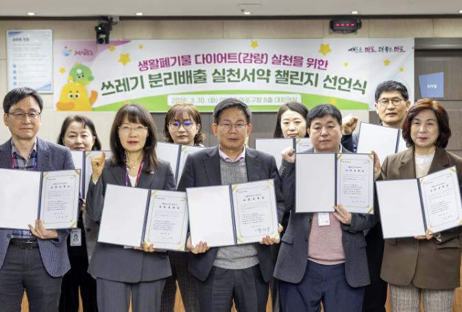박강수 마포구청장은 3월 10일 오전 9시 30분, 마포구청 8층 대회의실에서 열린 ‘쓰레기 분리배출 실천 서약 챌린지 선언식’에 참석해 올바른 분리배출 실천 의지를 밝혔다.이번 챌린지는 올해 1월 수도권 생활폐기물 직매립 금지 정책 시행에 따라 쓰레기 감량과 올바른 분리배출의 중요성이 더욱 커지면서 ‘생활폐기물 다이어트 천만 시민 실천 프로젝트’의 일환으로 마련됐다.이날 행사에는 박강수 마포구청장을 비롯해 부구청장과 간부 공직자들이 참석했으며, “연간 1인 쓰레기봉투 1개 줄이기, 깨끗한 마포 우리가 먼저 실천하겠습니다”라는 구호를 함께 외치며 캠페인의 시작을 알렸다.구는 이번 챌린지를 통해 음식물 쓰레기와 비닐·플라스틱·종이의 올바른 분리배출을 생활화하고, 다회용기 사용과 장바구니·텀블러 사용 등 주민이 참여하는 자원순환 문화를 정착시켜 나갈 계획이다.박강수 마포구청장은 “쓰레기를 줄이고 올바르게 분리배출하는 실천은 행정만의 노력으로는 이루어질 수 없으며 주민과 공직자가 함께해야 할 과제”라며, “공직자가 앞장설 때 주민 참여와 변화도 함께 확산될 것”이라고 말했다.