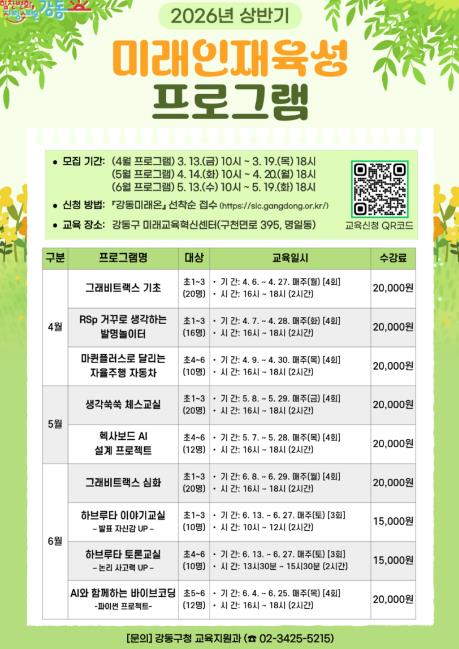 서울 강동구는 초등학생의 창의적 사고력과 문제해결 역량을 키우기 위해 2026년 상반기 ‘미래인재 육성 프로그램’을 운영한다고 밝혔다.이번 프로그램은 4월 6일부터 6월 29일까지 강동구 미래교육혁신센터(구천면로 395, 명일동)에서 관내 초등학생 130명을 대상으로 실시된다. 인공지능(AI), 발명과학, 사고력 분야를 중심으로 한 체험·실습형 교육과정 9개로 구성되며, 학생들이 직접 참여하고 배우는 활동 중심 수업으로 진행된다.주요 프로그램으로는 ▲헥사보드(Hexa Board, 코딩 교육용 전자 보드) 인공지능(AI) 설계 프로젝트 ▲인공지능(AI)와 함께하는 바이브코딩(Vibe Coding, 대화형 프로그래밍) ▲그래비트랙스(GraviTrax, 구슬과 트랙을 활용한 중력 원리 체험교구) ▲하브루타(Havruta, 짝을 지어 토론하는 유대인 전통 교육) 토론교실 등이 있으며, 놀이 요소와 학습 내용을 결합해 많은 학생들이 흥미를 가지고 참여할 것으로 기대된다.특히 `거꾸로 생각하는 발명 놀이터`는 문제를 다양한 시각에서 바라보는 과학적 사고력을 기를 수 있도록 구성됐으며, `헥사보드(Hexa Board) 인공지능(AI) 설계 프로젝트`와 `인공지능(AI)과 함께하는 바이브코딩(Vibe Coding)`은 인공지능(AI) 기술을 활용하여 학생들의 디지털 이해도를 높이도 데 중점을 두었다.또한, 이번에 새롭게 운영되는 `하브루타(Havruta) 토론교실`은 질문과 토론 중심 수업 방식으로 사고력과 발표 자신감을 함께 키울 수 있도록 마련됐다.매년 높은 만족도를 보였던 `마퀸플러스(Maqueen Plus, 교육용 로봇) 자율주행차`, `그래비트랙스(GraviTrax)`도 지속적으로 운영해 학생들이 협업과 문제해결 과정을 경험할 수 있도록 했다.이수희 강동구청장은 ˝미래인재육성 프로그램을 통해 학생들이 스스로 생각하고 도전하는 경험을 쌓아, 미래 사회에 필요한 역량을 갖춘 인재로 성장하길 기대한다˝라고 밝혔다.