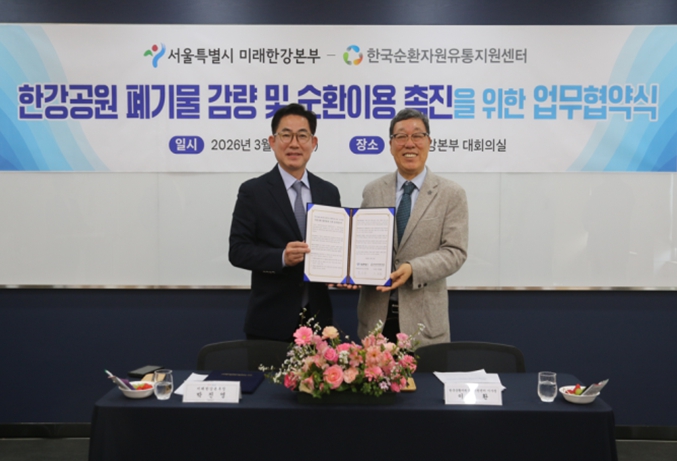 서울시 미래한강본부가 12일 한강공원 내 폐기물 감량 및 순환이용 촉진을 위해 폐기물 재활용 분야 전문기관인 한국순환자원유통지원센터(KOrea Resource circulation service Agency, KORA)와 업무협약을 체결했다. 협약식은 오후 2시 미래한강본부 대회의실에서 개최됐으며 박진영 서울시 미래한강본부장, 이명환 KORA 이사장 등 주요 관계자가 참석했다. 시는 KORA와의 협업을 통해 한강공원의 폐기물 회수 및 재활용 전반에 대한 전문성을 한층 강화할 계획이다. 시와 KORA는 ‘재활용 분리배출함’ 총 280여 대를 한강공원 전역에 설치할 예정이다. 분리배출 항목은 페트병, 캔, 플라스틱류 등 6개 품목으로 세분화하여 시민 편의를 높였다. 이를 통해 시민들의 자발적이고 올바른 분리배출 참여를 유도, 폐기물 수거 효율을 높일 수 있을 전망이다. 양 기관은 성공적인 자원순환 모델 구축을 위해 다방면으로 협력하기로 뜻을 모았다. 주요 협력 내용은 재활용 가능 자원의 회수 및 재활용량 증대를 위한 회수 체계 구축 ·운영, 폐기물 감량 및 재활용 분야 질적 개선을 위한 행정적·재정적·기술적 지원, 재활용 활성화를 위한 시민 공감대 형성 및 홍보 등이다. 특히 이번 협약은 서울시가 추진 중인 `생활폐기물 다이어트 천만 시민 실천 프로젝트` 목표인 ‘1인당 연간 종량제봉투 1개 줄이기’ 달성에도 이바지할 것으로 기대된다. 미래한강본부는 이번 협력으로 연간 발생하는 한강공원 내 혼합쓰레기 발생량이 상당 부분 감소할 것으로 내다보고 있다. 아울러 쓰레기 발생이 집중되는 성수기에는 보다 신속한 분리수거 체계를 가동, 쾌적한 한강공원 환경을 유지할 계획이다. 박진영 서울시 미래한강본부장은 “KORA와의 이번 협약을 통해 한강공원이 단순한 휴식처를 넘어 자원순환의 상징적인 장소로 거듭나길 바란다”며 “시민 여러분께서도 성숙한 시민의식으로 올바른 분리배출에 적극 동참해 주시길 부탁드린다”고 말했다.