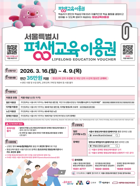 서울시는 ‘약자와의 동행’ 일환으로 경제적 여건에 따른 교육격차를 완화하고, 서울시민의 자기계발과 자아실현을 지원하기 위해 ‘평생교육이용권’ (1인당 35만원)을 총 18,959명에게 지급할 예정이다. 서울시는 16일 오전 10시부터 4월 9일 18시까지 ‘2026년 평생교육이용권’ 지원을 받을 시민들을 모집한다고 밝혔다. ‘평생교육이용권’은 19세 이상 성인인 서울시민이 자격증, 어학, 창업, 인문학 등 다양한 평생교육 과정을 수강할 수 있도록 교육비를 지원하는 제도다. 시는 올해는 18,959명에게 1인당 연간 35만 원, 총 66억 원 규모의 이용권을 지급할 계획이다. 작년부터 기존 국가(교육부)가 운영하던 ‘평생교육바우처’가 법률상 용어인 ‘평생교육이용권’으로 사업명을 변경, 사업 운영 주체가 교육부에서 각 지자체로 이관돼 서울시와 자치구 및 서울특별시 평생교육진흥원이 사업을 운영한다. 올해 1차 모집 유형별 지원인원은 일반(19세 이상 기초생활수급자 및 차상위계층) 1만 4,332명, 디지털(30세 이상) 성인 1,685명, 노인(65세 이상) 1,346명, 장애인(19세 이상 등록장애인) 1,596명이며 유형 간 중복 지원은 불가하다. 이번 1차 모집 유형 가운데 ‘일반 이용권’은 ‘기초생활수급자’ 및 ‘차상위계층’만 신청이 가능하며, 나머지 유형은 소득과 무관하게 신청할 수 있으나 신청자가 많을 경우 ‘기초생활 수급자’ 및 ‘차상위계층’을 우선 선정한다. ‘일반 이용권’은 서울시 평생교육이용권 누리집, ‘장애인 이용권’은 정부24 누리집에서 신청할 수 있다. 신청 관련 자세한 문의는 전화 또는 서울톡 챗봇 상담 등 다양한 채널을 통해 할 수 있다. 신청자를 대상으로 자격 충족 여부를 판단해 자격 충족 신청자가 모집 인원을 초과할 경우엔 추첨을 통해 최종대상자를 선발한다. 선정 결과는 4월 22일 평생교육이용권 누리집에서 확인할 수 있으며, 대상자에게는 개별 안내된다. 1차 모집 후 잔여분 발생시 5월 초 소득과 무관하게 서울시민을 대상으로 2차 모집을 실시하여 선발할 예정이다. 최종 선발된 시민은 4월 24일부터 NH농협 채움카드(신용 또는 체크카드)를 통해 연간 최대 35만 원 상당의 포인트를 제공받는다. 지원받은 포인트는 올해 12월 31일까지 ‘평생교육이용권 사용기관’으로 등록된 교육기관에서 자격증, 창업, 어학, 인문학 등 다양한 강좌 수강료와 교재비로 지원금을 사용할 수 있다. 총 35만 원 중 강좌 수강료만큼 차감되는 방식으로 선정된 본인 사용 및 수강이 원칙이다. 강좌 수강 없이 교재만 구매하거나 유무선 전자‧통신기기 구매 등은 할 수 없다. 서울시와 서울시평생교육진흥원은 더 많은 교육기관에서 평생교육이용권을 사용할 수 있도록 평생교육시설 대상으로 사업 설명회를 3월 중 개최할 예정이며, 평생교육의 가치와 중요성을 널리 알리도록 하반기에 우수사례를 공모하여 이용권에 대한 긍정적 인식을 확산할 예정이다. 정진우 서울시 평생교육국장은 “AI‧디지털 등 급격한 사회 변화 속에서 평생교육을 통한 성인들의 지속적인 역량 개발은 필수”라며, “서울시는 ‘약자와의 동행’ 정책을 바탕으로 서울시민이 더 나은 삶을 설계할 수 있도록 촘촘히 지원하겠다”고 밝혔다.