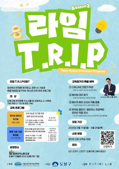 서울 도봉구가 서울로봇인공지능과학관(RAIM)이 주최하는 `2026년 RAIM T.R.I.P(동행 로봇 발명프로그램)` 참여 자치구로 선정됐다고 밝혔다.이에 따라 구는 서울로봇인공지능과학관(RAIM)과 함께 초등학교 4~6학년 학생 대상으로 로봇·인공지능(AI) 기술을 활용한 ‘동행 로봇 발명 프로그램’을 운영한다.이번 프로그램은 학생들이 일상 속 문제를 발견하고 로봇·인공지능(AI) 기술을 활용해 해결 방법을 탐구하는 청소년 인재 양성 프로그램이다.프로그램은 메이커스쿨 도봉(도봉구청 1층)에서 진행되며, ▲입문과정 ▲기초기술과정 ▲메이킹데이 참가 ▲메이커페어 출품 연계 등 단계별로 운영된다.모집 대상은 도봉구에 거주하는 초등학교 4~6학년 학생이다. 1기와 2기로 나누어 15명씩 모집한다.신청은 3월 26일까지 홍보 포스터 내 정보무늬(QR)로 하면 되며, 선착순으로 접수를 마감한다. 모집 일정과 신청 방법 등 자세한 사항은 도봉구 누리집에서 확인 가능하다.오언석 도봉구청장은 ˝단순 로봇 체험을 넘어, 아이들이 생활 속 문제를 스스로 발견하고 협동하며 해결책을 만들어가는 과정을 경험할 수 있길 바란다.“라고 말했다.