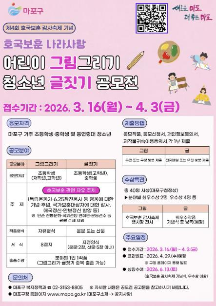 마포구는 제4회 호국보훈 감사축제를 맞아 어린이와 청소년이 국가보훈대상자의 희생과 헌신을 기억하고 나라사랑의 의미를 되새길 수 있도록 ‘호국보훈·나라사랑 어린이 그림그리기·청소년 글짓기 공모전’을 개최한다.공모 기간은 4월 3일 오후 6시까지이며, 주민등록상 마포구에 거주하는 초등학생과 중학생 및 동연령대 청소년이면 누구나 참여할 수 있다.공모 분야는 그림그리기와 글짓기 두 부문으로 진행된다.그림그리기 부문은 초등학생을 대상으로 하며, 수채화·포스터·컷 만화 등 자유 형식의 작품을 8절지에 담아 제출하면 된다. 시상은 저학년부와 고학년부로 나눠 진행된다.글짓기 부문은 초등학교 고학년과 중학생을 대상으로 하며, 시나 에세이 등 운문 또는 산문 형식으로 작성해 지정 양식에 맞춰 제출하면 된다. 지정 양식은 마포구 누리집 공지사항에서 내려받을 수 있으며, 시상은 초등부와 중등부로 나눠 진행한다.그림과 글짓기(운문 또는 산문)는 중복하여 출품 가능하나, 각 부문별로 1인 1작품만 제출할 수 있다.작품 주제는 독립운동가와 6·25 참전용사 등 국가를 위해 헌신한 영웅에 대한 기억과 감사, 애국정신과 안보의식 등 호국보훈과 관련된 내용이다.단, 단순 전통문화, 국위선양 연예인·운동선수 등 관련 주제는 제외된다.접수된 작품은 외부 전문가 심사를 거쳐 총 40명을 선정해 상장을 수여한다.수상자는 오는 6월 13일 열리는 ‘제4회 호국보훈 감사축제’ 기념식에서 시상할 예정이며, 우수 작품은 행사장에 전시하거나 낭독할 예정이다.작품은 우편 또는 방문, 전자메일을 통해 제출 가능하며 자세한 사항은 마포구청 누리집 공지사항에서 확인할 수 있다.지난해 열린 제3회 호국보훈·나라사랑 어린이 그림그리기·청소년 글짓기 공모전에서는 그림그리기 156점, 글짓기 15편 등 총 171점의 작품이 접수되는 등 높은 참여를 보였다.출품작에는 독립운동가와 참전용사에 대한 감사의 마음과 나라사랑의 의미를 담은 다양한 이야기들이 담겼으며, 어린이와 청소년의 시선으로 풀어낸 진정성 있는 표현이 눈길을 끌었다.박강수 마포구청장은 “이번 공모전을 통해 호국보훈의 의미를 되새기고 나라사랑의 가치를 생각해 보는 기회가 되길 바란다”라며, “많은 어린이들과 청소년들의 관심과 참여를 바란다”고 말했다.