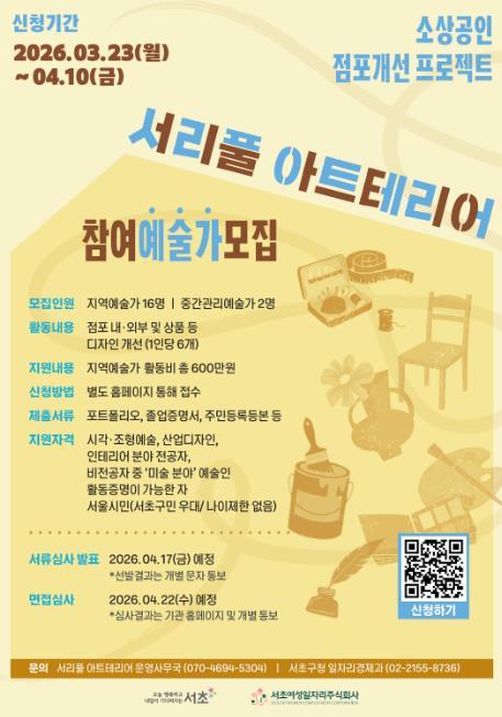 서울 서초구가 낡고 오래된 소상공인 점포를 예술적인 디자인으로 업그레이드하는 ‘2026년 서리풀 아트테리어 사업’을 추진하며 골목상권 새 단장에 나선다.‘아트테리어(Art+Interior)’는 지역 예술가의 창작 역량을 활용해 점포의 내·외부를 경쟁력 있는 브랜드 공간으로 개선하는 사업이다. 간판·천막·차림표 등 공간 요소 향상은 물론, 로고나 상호명 등 브랜딩까지 점포 특성에 맞춰 차별화하는 맞춤형 지원을 제공한다. 이를 통해 소상공인은 점포 환경을 개선하고, 예술가는 현장 기반의 일자리를 경험하는 기회를 얻는다. 특히, 올해는 점포당 재료비를 지난해보다 10만원 높여 최대 290만원까지 지원하며 개선의 질을 높인다는 계획이다.참여자 모집은 오는 23일부터 다음 달 10일까지 3주간이다. 사업에 참여할 소상공인 점포 100개소와 지역 예술가 18인을 모집한다. 참여 대상 점포는 서초구 소재의 상시근로자 5인 미만인 곳으로, 상품 및 서비스 구매가 가능한 매장형 점포여야 한다. 다만, 유흥업종, 공고일 기준 업력 1년 이하 점포, 과거 아트테리어 사업 참여 점포는 제외된다. 참여 예술가는 디자인‧인테리어 분야 전문가로, 관련 활동 증명이 가능한 사람이어야 한다. 서울시민이면 참여할 수 있고, 서초구민인 경우 가산점이 있다.자세한 사항은 서초구청 누리집 공고문에서 확인할 수 있으며, 구는 이후 선정위원회 심사를 거쳐 최종 참여 점포와 예술가를 선정할 계획이다.선정 이후, 구는 참여 점포가 희망하는 개선 유형과 지역 예술가의 역량을 고려해 적정 조합으로 매칭하고, 초기 아이디어 회의부터 제작까지 공동 작업이 원활히 진행되도록 지원한다. 소상공인이 제시한 개선 필요 사항을 바탕으로 지역 예술가가 디자인을 기획·제안하고, 제작·설치까지 연계해 점포 환경 개선을 완성하는 방식이다.올해는 ‘서리풀 아트테리어 전용 소통 플랫폼’을 구축해 기획·디자인·제작·설치 등 전 과정에서 점포와 예술가가 플랫폼 기반으로 언제, 어디서나 소통할 수 있도록 했다. 이를 통해 진행 상황 공유와 요청 사항 처리가 신속해지고, 협업 과정에서 발생할 수 있는 혼선과 일정 지연을 줄여 사업 추진의 안정성을 높일 것으로 기대하고 있다.한편, 서리풀 아트테리어 사업은 2019년부터 현재까지 총 610개소를 지원해 참여 소상공인과 예술가의 만족도가 90% 이상으로 나타난 서초구 대표 소상공인 지원 사업이다. 구 관계자는 해당 사업이 지역 상권 경쟁력 강화와 쾌적하고 매력적인 골목 환경 조성에 크게 기여하고 있다고 밝혔다.전성수 서초구청장은 “서리풀 아트테리어를 통해 소상공인에게는 점포 경쟁력을, 예술가에게는 현장 실무 경험을 제공하며 지역경제의 선순환을 만들어 가겠다”며, “점포 환경 개선을 희망하는 소상공인과 역량있는 지역 예술가의 많은 관심과 참여를 바란다”고 말했다.