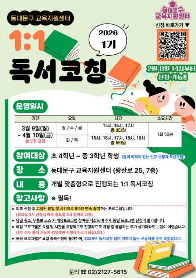 서울 동대문구가 학생 맞춤형 독서교육 프로그램인 ‘2026년 상반기 1:1 독서코칭’을 운영한다.동대문구 교육지원센터에서 진행되는 이번 프로그램은 초등학교 4학년부터 중학교 3학년까지를 대상으로 하며, 학생 개개인의 수준과 특성에 맞춘 1:1 맞춤형 코칭으로 운영된다. 1기는 3월 9일부터 4월 10일까지 5주간 진행되며, 기수별 28명이 참여한다.프로그램은 단순한 독서 지도에 그치지 않는다.회차별 50분 수업을 통해 학생의 독서 수준을 진단하고, 이에 맞는 교재를 활용해 읽기→토론→글쓰기까지 연결되는 통합형 독서 활동으로 구성된다. 전문 강사가 학생별 맞춤 커리큘럼을 적용해, 이해력뿐 아니라 사고력과 표현력까지 함께 키우는 데 중점을 둔다.이러한 운영 방식은 실제 참여 학생들의 변화로 이어지고 있다.지난해 프로그램에 참여한 학생과 학부모들은 “책 읽기가 더 재미있어졌다”, “자기 전 독서 습관이 생겼다”, “긴 글도 자연스럽게 읽게 됐다”, “내 생각을 글로 표현하는 데 도움이 됐다”는 등 구체적인 학습 변화와 긍정적 경험을 공통적으로 언급했다.실제로 구는 2025년 한 해 동안 70명을 대상으로 총 367회의 독서코칭을 운영했으며, 만족도 조사에서도 평균 4.7점(5점 만점)을 기록하며 높은 호응을 얻었다.구는 이러한 성과를 바탕으로 올해는 약 100명, 총 500회 규모로 프로그램을 확대 운영할 계획이다.이필형 동대문구청장은 “독서는 학습의 출발점이자 사고력을 키우는 가장 중요한 기반”이라며 “1:1 맞춤형 독서코칭을 통해 학생들이 스스로 생각하고 표현하는 힘을 기를 수 있도록 지속적으로 지원하겠다”고 밝혔다.