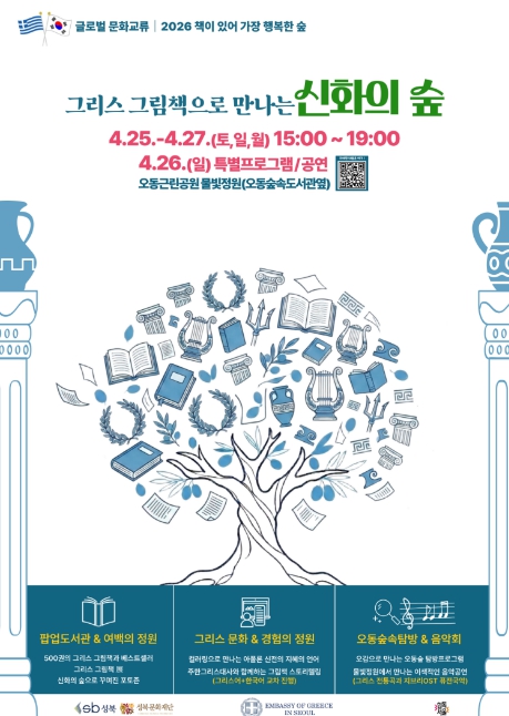서울 성북구와 성북문화재단이 ‘세계 책과 저작권의 날(World Book and Copyright Day, 4월 23일)을 기념해 주한그리스대사관과 협력한 글로벌 문화교류 행사『책이 있어 가장 행복한 숲』을 오는 4월 25일부터 27일까지 오동근린공원 내 물빛정원에서 개최한다.이번 행사는 주한그리스대사관과의 협력으로 행사장 전체를 `그리스 그림책으로 만나는 ‘신화의 숲’` 주제로 조성해 숲에서 만나는 ‘그리스 그림책展’과 포토존, 고대 그리스 아폴론 신전의 ‘지혜의 언어’를 활용한 컬러링 체험, 팝업도서관 등을 상시 운영한다.올해 행사는 오동숲속도서관 인근의 아름다운 숲 환경을 배경으로 책을 통해 그리스의 역사와 문화를 만나볼 수 있는 특별한 문화교류 프로그램으로 마련됐다.행사장 전역에는 ▲500여 권의 도서를 갖춘 ‘팝업도서관’ ▲숲속에서 감상하는 ‘그리스 그림책展’ ▲신화 속 장면을 재현한 ‘포토존’이 운영된다. 특히 고대 그리스 아폴론 신전의 델픽 격언을 배우는 ‘지혜의 언어 컬러링’과 ‘그리스 알파벳 스탬프 체험’은 어린이들이 고대 그리스 문화를 친숙하게 접할 수 있는 기회를 제공할 예정이다.메인 프로그램은 4월 26일에 진행되는 ‘주한그리스대사 스토리텔링’으로, 루카스 초코스(H.E. Mr. Loukas Tsokos) 주한그리스대사가 직접 그리스어로 그림책을 낭독하고 한국어 활동가가 함께 이야기를 들려주는 방식으로 진행된다. 언어를 넘어 책으로 소통하는 특별한 문화교류의 시간이 될 것으로 기대된다이외에도 오감을 활용해 숲을 경험하는 ‘오동숲속 탐방’과 그리스 전통곡 및 지브리 애니메이션 OST를 국악으로 재해석한 ‘퓨전국악 음악회’가 열려 숲과 책, 음악이 어우러지는 특별한 시간을 선사할 예정이다.행사는 3일간 오후 3시부터 7시까지 운영되며 누구나 자유롭게 참여할 수 있다. 자세한 프로그램 안내 및 사전 접수 방법은 성북구립도서관 누리집에서 확인할 수 있다.한편, 성북구는 글로벌 문화교류를 지속적으로 확대해 오는 9월에는 주한핀란드대사관과 협력한 가을 시즌 『책이 있어 가장 행복한 숲』 행사도 개최할 계획이다.이승로 성북구청장은 “『책이 있어 가장 행복한 숲』은 책을 매개로 세계의 문화를 만나고, 숲속에서 독서의 즐거움을 함께 나누는 특별한 자리”라며 “앞으로도 다양한 국제 문화교류와 독서문화 프로그램을 통해 구민들이 일상 속에서 책과 문화를 더욱 가까이 누릴 수 있도록 노력하겠다”고 말했다.