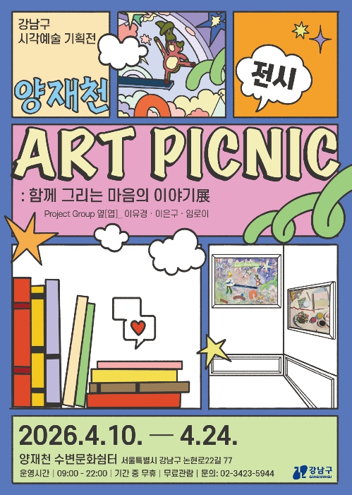 꿈이 모이는 도시, 미래를 그리는 강남구가 4월 10일부터 24일까지 양재천 수변문화쉼터에서 참여형 시각예술 기획전 ‘아트 피크닉(ART PICNIC) : 함께 그리는 마음의 이야기전’을 연다.이번 전시는 양재천 산책로를 찾는 시민들이 자연 속에서 예술을 보다 친근하게 즐길 수 있도록 마련했다. 프로젝트그룹 ‘옆’의 이유경·이은구·임로이 작가가 참여하며, 전시장 전체를 하나의 거대한 만화 페이지처럼 구성한 것이 특징이다. 관람객은 작품을 바라보는 데 그치지 않고 공간 안을 거닐며 장면의 일부가 돼 이야기를 함께 완성하게 된다.전시장 바닥에는 사람이 들어갈 수 있을 만큼 큰 만화 칸이 펼쳐진다. 관람객은 그 위에 앉거나 칸 사이를 오가며 공간을 자유롭게 체험할 수 있다. 관람객의 움직임 자체가 하나의 장면이 되면서 전시장 전체가 살아 있는 만화 페이지처럼 구현된다.비어 있는 말풍선과 ‘말풍선 도시락’ 오브제도 설치된다. 관람객은 준비된 쿠션과 다양한 소품을 활용해 직접 장면을 만들고, 만화 칸을 넘나들며 마치 한 페이지씩 넘기듯 이야기를 체험할 수 있다. 만화 속 주인공이 된 듯한 순간을 사진으로 남길 수 있다는 점도 이번 전시의 매력이다.구는 이번 전시를 통해 양재천을 찾는 시민들이 산책하듯 머물며 각자의 이야기를 더하고, 자연과 예술이 어우러진 ‘예술 소풍’을 즐길 수 있도록 기획했다. 전시장에는 작가들의 동화적이고 이색적인 일러스트 작품 27점도 함께 선보인다. 전시는 오전 9시부터 오후 10시까지 운영하며, 누구나 무료로 관람할 수 있다.조성명 강남구청장은 “양재천을 찾는 시민들이 봄 풍경 속에서 산책과 함께 예술을 자연스럽게 경험하고 직접 참여하며 즐길 수 있는 전시가 되길 바란다”며 “앞으로도 다양한 문화예술 프로그램을 통해 시민들이 가까이에서 문화예술을 향유할 수 있도록 힘쓰겠다”고 말했다.