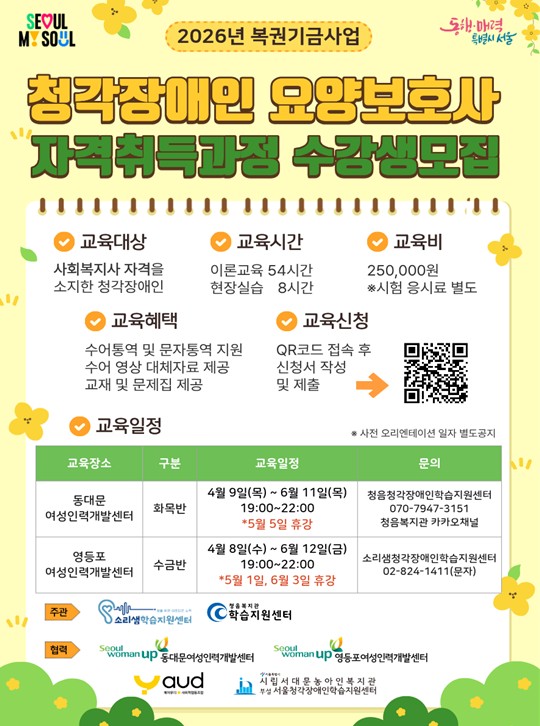 서울시가 지난해에 이어 올해에도 청각장애인 요양보호사 양성교육을 추진한다. 올해 교육엔 40명을 대상으로 서울시는 청각장애인들의 원활한 학습을 위해 수업에 수어통역사를 배치하고 동시 문자통역을 제공한다. 또 혼자서도 자격시험을 준비할 수 있도록 지난해 제작한 자격증 관련 수어영상 학습자료를 제공·활용할 예정이다. 시는 요양보호사 양성교육에 대해 청각장애인들이 많은 관심과 참여 의지를 표현함에 따라 해당 사업을 올해도 이어가기로 했다. 서울시가 추진하는 ‘2026 청각장애인 요양보호사 양성 교육’은 4월 8일부터 6월 12일까지 9주간 청각장애인 40명을 대상으로 진행된다. 시는 보다 실효성 있는 교육이 될 수 있도록 지난해보다 3개월 빠른 4월에 교육을 시작하기로 했으며, 수업 시간도 12시간 추가 편성했다. 교육은 지난해에 이어 올해에도 동대문과 영등포여성인력개발센터가 담당하며 서울형 좋은돌봄인증기관과 연계하여 현장실습까지 진행된다. 동대문·영등포 여성인력개발센터는 `2025년 서울시 민관협력 우수사례집`에 선정·게재된 기관이다. 실습은 한사랑강남재가노인복지센터, 남부데이케어센터, 벧엘데이케어센터 등 3개 기관을 통해 진행될 예정이다. 이번 청각장애인 요양보호사 양성교육 사업에는 복권기금 3,000만 원이 투입된다. 복권기금은 법정배분사업과 저소득층의 주거안정 지원사업, 소외계층에 대한 복지사업 등 복권위원회가 선정한 공익사업 등에 사용된다. 또한 작년에 만족도가 높았던 수업진행시 수어통역사 배치와 동시 문자통역 제공을 올해에도 적용하며, 혼자서 자격시험을 준비하는데 도움이 될 수 있도록 수어영상 대체자료를 활용·배포한다. 지난해에는 요양보호사 자격시험 단어해설집 295개, 문제분석 800문제, 모의고사 1,400제 등 약 2,500여 개의 자료를 수어영상으로 제작·제공했다. 1일에는 수강생들을 대상으로 온라인 및 오프라인 동시에 진행되는 오리엔테이션을 개최했다. 오리엔테이션에서는 사업에 대한 설명부터 교육일정 및 내용, 지원체계를 안내하고 질의 응답시간을 가지며 수강생들이 앞으로 진행될 수업을 준비할 수 있도록 도왔다. 오리엔테이션 참가 수강생들은 “요양보호사 자격증을 따서 안정적인 직업을 가지고 싶다”, “부모님이 고령이신데 가족돌봄을 하게 되면 좋을 것 같다” 등 높은 관심과 기대감을 나타냈다. 서울시는 지난해 처음으로 청각장애인의 경제적 자립과 사회참여를 촉진하고 나아가 수어로만 의사소통이 가능한 청각장애 어르신 돌봄에 도움이 되기 위해서 청각장애인 요양보호사 양성교육을 시작했다. 교육은 40명을 대상으로 7월부터 7주간 진행됐으며, 그 결과 26명이 요양보호사 자격증을 따는 성과를 냈다. 시는 청각장애인들이 편하게 시험에 임할 수 있도록 지난해 자격시험에 단체 응시장을 운영하고 수어 통역사를 배치하여 사전 안내를 진행했다. 특히 시험시간 또한 1.5배로 연장했다. 합격생에 대해서는 수어를 사용하는 돌봄 요구자와 원활하게 연계될 수 있도록 서울형 좋은돌봄인증기관 등에 홍보·안내를 실시했다. 시는 작년에 이어 올해도 수어 영상으로 요양보호사 시험을 치를 수 있게끔 보건복지부에 제도 개선을 지속적으로 건의할 예정이다. 조은령 서울시 장애인자립지원과장은 “청각장애인 요양보호사 양성 교육은 장애인의 취업 및 사회참여 기회의 폭을 더욱 넓기는 계기가 될 것”이라며 “이번 교육 이외에도 장애인들의 자립과 사회참여를 돕는 다양한 정책을 추진해 나가도록 노력하겠다”라고 밝혔다.
