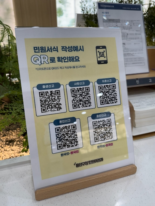 서울 용산구가 구민들이 가족관계등록신고서 작성을 수월하게 할 수 있도록 주요 서식 4종에 대해 정보무늬(QR코드) 작성 예시 안내 서비스를 제공한다.기존에는 민원실을 직접 방문해 필경대에 부착된 견본을 보면서 작성할 수 있어 다수 민원인이 방문 시 견본 확인과 신고서 작성에 불편함이 있었다. 또한 내용이 많거나 작성 요령이 어려운 서식은 오류나 누락으로 처리 시간이 길어져 민원 처리 대기시간이 늘어나는 경우도 잦았다.구는 이러한 불편함을 줄이고 작성 어려움을 해소하기 위해 주요 신고서의 작성 예시를 정보무늬(QR코드)로 제작해 구 누리집에 게시하고, 구청 민원실에 비치했다.정보무늬(QR코드)로 작성 예시를 확인할 수 있는 민원 서식은 ▲출생신고서 ▲혼인신고서 ▲사망신고서 ▲이혼신고서 총 4종이다. 정보무늬(QR코드)는 거치대를 활용해 안내하는 한편, 서식 상단에도 삽입‧인쇄했다. 구 누리집에서는 종합민원 하단 메뉴로 마련했다.민원 서식도 보완했다. 민원인의 작성 오류가 많은 항목은 테두리를 강조하는 등 작성 편의성을 높였다.구는 정보무늬(QR코드)를 통해 민원인의 대기시간을 줄이고 민원실을 방문하지 않아도 언제 어디서든 민원서류를 작성할 수 있어 구민들이 더욱 편리하고 신속한 민원서비스를 이용할 수 있을 것으로 기대하고 있다.박희영 용산구청장은 “구민 여러분께서 가족관계등록신고서를 보다 쉽고 편리하게 작성하실 수 있게 됐다”라며 “앞으로도 용산구는 민원 처리 과정에서의 불편을 최소화하고 구민 중심의 신속하고 친절한 서비스를 제공하기 위해 최선을 다하겠다”라고 밝혔다.