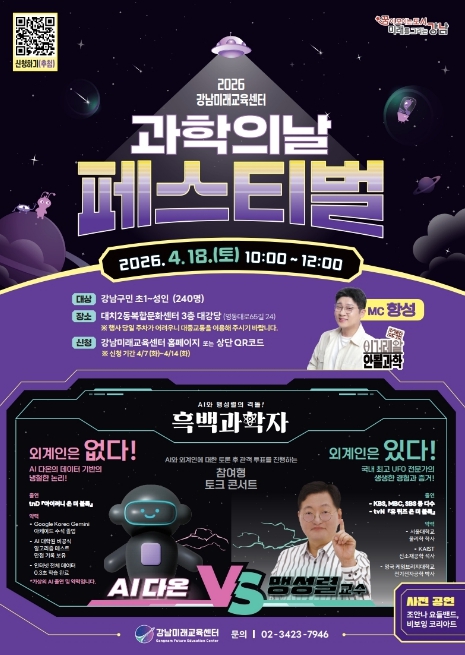 꿈이 모이는 도시, 미래를 그리는 강남구가 4월 18일 오전 10시부터 낮 12시까지 대치2동복합문화센터에서 ‘과학의 날 페스티벌’을 개최한다.과학의 날(4월 21일)은 과학기술의 중요성을 알리고 과학의 대중화를 촉진하기 위해 지정된 법정기념일이다. 강남미래교육센터는 이를 기념해 2023년부터 학생들이 과학과 첨단기술을 직접 체험할 수 있는 페스티벌을 운영해 왔다. 올해는 토크콘서트와 공연, 체험 프로그램을 한층 강화해 흥미롭고 몰입감 있게 즐길 수 있도록 구성했다.이번 행사의 핵심 프로그램은 참여형 토크콘서트 ‘흑백과학자’다. ‘UFO는 과학인가, 착각인가’를 주제로 국내 UFO 전문가인 우석대학교 맹성렬 교수와 생성형 인공지능(AI) ‘다온’이 토론 대결을 펼친다. 단순 강연이 아니라 인간 전문가와 AI가 같은 주제를 놓고 서로 다른 방식으로 논리를 펼치고, 관객이 직접 투표에 참여해 의견을 나누는 방식으로 진행된다.사회는 과학 유튜브 채널 ‘안될과학’의 크리에이터 ‘항성’이 맡는다. 과학적 호기심을 자극하는 주제를 쉽고 흥미롭게 풀어내, 학생과 학부모 모두가 함께 즐길 수 있는 무대가 될 것으로 기대된다.행사 전에는 요들밴드 공연과 비보잉 퍼포먼스가 펼쳐져 축제 분위기를 더한다. 현장에는 생성형 AI를 직접 체험할 수 있는 체험존도 마련돼 참가자들이 최신 기술을 보다 가깝게 접할 수 있다.참여 신청은 4월 14일까지 강남미래교육센터 홈페이지 또는 홍보 포스터의 QR코드를 통해 받는다. 모집 인원은 240명이며, 참가자는 추첨을 통해 선정해 4월 16일 발표할 예정이다.조성명 강남구청장은 “이번 페스티벌은 과학을 보고 듣는 데서 그치지 않고, AI와 함께 생각하고 토론하며 즐길 수 있도록 마련한 참여형 행사”라며 “앞으로도 변화하는 기술 환경에 맞춰 학생들이 과학과 미래기술을 쉽고 흥미롭게 접할 수 있는 교육·체험 기회를 계속 넓혀 가겠다”고 말했다.