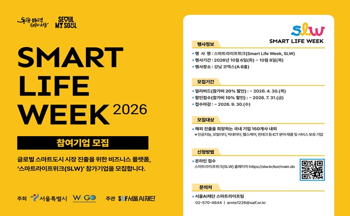 서울시가 인공지능(AI)과 정보통신기술(ICT)을 앞세운 글로벌 도시 비즈니스 무대인 ‘스마트라이프위크(Smart Life Week, SLW)’를 글로벌 스마트도시 시장 진출을 위한 전략 플랫폼으로 육성하는 가운데, 2026년 행사에 참가할 기업 모집에 나섰다. 시는 ‘AI로 그리는 미래도시의 일상’을 주제로 10월 6일부터 8일까지 코엑스에서 ‘SLW 2026’을 개최하고, 이에 참여할 국내 기업을 9월 30일까지 모집한다. 올해로 3회째를 맞는 이번 행사에는 약 500개 글로벌 도시·기업과 정책 관계자들이 한자리에 모여 기술과 도시 운영 전략을 공유할 것으로 예상된다. SLW는 기업 간 거래(B2B)를 넘어 기업-정부 간 협력(B2G), 도시 간 정책 교류(G2G)를 아우르는 글로벌 플랫폼으로, 기술·정책·도시가 동시에 연결되는 점에서 기존 전시회와 차별화된다. 특히 올해는 단순 전시를 넘어 해외 도시와의 실질적인 협력까지 이어지는 ‘성과형 플랫폼’으로 운영된다. 현장에서는 AI·스마트도시 기술 전시를 비롯해 국제 포럼, 콘퍼런스, 글로벌 바이어 연계 프로그램, 서울 스마트도시상 시상식 등이 함께 진행된다. 시는 올해부터 SLW의 기관·기업 전시관인 ‘혁신관’의 참가비를 유료로 전환했지만, 기업의 참여 부담을 최소화하는 방향으로 설계했다. 참가비는 국내 주요 IT 전시 대비 약 3분의 1 수준으로 4월 30일까지 신청 시 참가비 20% 할인과 부스 위치 우선 배정 혜택을, 7월 31일까지 신청 시 10% 할인 혜택을 제공한다. 모집 대상은 해외 진출을 희망하는 국내 기업으로, 인공지능(AI)·빅데이터·모빌리티·헬스케어·핀테크 등 ICT 전 분야에서 우수 제품 또는 서비스를 보유한 기업이다. 시는 최근 AI 산업과 정책 수요가 빠르게 확대되면서 관련 기술 기업들의 참여가 크게 늘어날 것으로 기대하고 있다. 참가기업은 해외 도시 및 공공 관계자를 대상으로 1대1 기술 발표, 비즈니스 상담, 네트워킹 프로그램 등에 참여해 실질적인 협력 기회를 확보할 수 있다. 또한 모든 참가기업은 ‘SLW 시민혁신상’ 후보로 자동 등록되며, 시민 현장 투표를 통해 선정된 우수기업 10개사에는 서울특별시장상이 수여된다. 체험형 공간인 ‘쇼룸(Show Room)’은 별도 부스 비용 없이 참여할 수 있어 기업의 기술 경쟁력을 효과적으로 홍보할 수 있다. 쇼룸은 서울의 7개 랜드마크를 통해 AI 기술이 어떻게 작동하는지를 체험할 수 있도록 구성된다. 참가 신청 및 세부 사항은 스마트라이프위크 공식 누리집에서 확인할 수 있다. 한편 지난해 SLW에는 330개 기업과 71개국 130개 도시가 참여하고, 6만여 명이 방문했다. 특히 해외 도시와 국내 기업을 1:1로 연결하는 ‘PYC(Present for Your City)’ 프로그램을 통해 25개 기업이 17개 해외 도시를 대상으로 총 28건의 솔루션 발표를 진행하는 등 단순 전시를 넘어 글로벌 비즈니스 플랫폼으로서 가능성을 입증했다. 강옥현 서울시 디지털도시국장은 “스마트라이프위크는 국내 기업이 해외 도시와 직접 연결되는 비즈니스 창구”라며, “기술이 실제 프로젝트로 이어질 수 있도록 지원을 강화하겠다”라고 말했다.