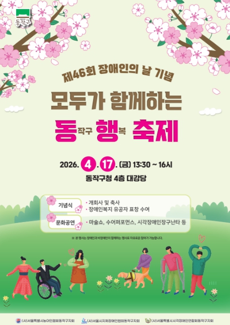 동작구가 제46회 장애인의 날을 맞아 ‘모두가 함께하는 동행축제’를 개최해 장애인과 비장애인이 함께 소통하고 화합하는 장을 만든다.4월 20일 장애인의 날은 장애인에 대한 이해와 장애인의 재활 의욕을 고취하고, 복지 증진의 계기를 마련하기 위해 제정한 날이다.행사는 내일(17일) 오후 1시 30분부터 4시까지 동작구청 4층 대강당에서 장애인·가족·장애인시설종사자 등 300여 명이 참석한 가운데 진행된다.기념식 1부 식전공연으로는 시각장애인 싱어송라이터 신재혁이 ‘봄봄봄’, ‘sugar’ 등 감미로운 노래로 행사의 시작을 알리고, 시각장애인 연주자 5인으로 구성된 금관악 5중주 ‘레조넌스 브라스’가 아름다운 선율을 선사한다.개회식은 시각장애인 이창훈 아나운서의 사회로 열리며, 국민의례와 개회선언에 이어 장애인의 자립 이야기를 담은 미니 다큐멘터리 ‘오늘도, 우리는 스스로 살아갑니다’가 상영된다.이후 ▲장애인 ▲복지시설 종사자 ▲자원봉사자 등 동작구 장애인복지증진에 기여한 유공자 10명 내외에게 표창을 수여한다.기념식 2부에서는 ‘모두가 함께’를 주제로 장애인과 가족, 시설종사자가 참여하는 퍼즐 퍼포먼스가 펼쳐진다.축하공연에는 ▲마술쇼(홍지안) ▲수어 퍼포먼스(청각장애인 김우경) ▲장구난타(시각장애인 럭키세븐) ▲노들가요제 수상자 서재현 등 다채로운 무대가 이어져 행사의 대미를 장식할 예정이다.특히 이번 행사는 ▲시각장애인을 위한 시각장애인현장해설사 ▲청각장애인을 위한 수어 통역 ▲지체장애인을 위한 휠체어 전용 좌석 확보 등 무장애 환경을 조성해 모두가 함께 어울리며 의미있는 시간을 나눌 수 있을 것으로 기대된다.한편, 구는 ▲서울시 최초 장애인 전용 헬스장 ▲장애아동 통학 지원 서비스 ▲중증장애인 배상책임보험 ▲장애인 친화 미용실 등 장애인을 위한 지원 사업을 다각적으로 추진하며 장애인의 전반적인 삶의 질 향상과 자립 기반 강화를 위해 노력하고 있다.박일하 동작구청장은 “이번 동행축제는 단순한 기념행사가 아니라, 장애인과 비장애인이 서로의 삶을 이해하고 화합하며 마음의 거리를 좁혀가는 자리”라며, “동작구는 장애 여부와 관계없이 누구나 동등한 지역사회를 만들기 위해 지원을 아끼지 않겠다”고 말했다.