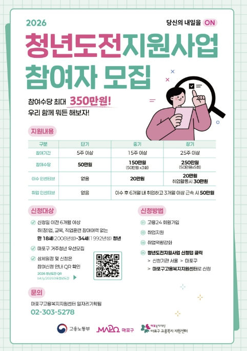 마포구가 구직단념청년의 사회 재진입을 돕는 ‘청년도전지원사업’ 규모를 130명으로 확대하며 지원을 강화한다.‘청년도전지원사업’은 구직에 어려움을 겪는 청년에게 자신감 회복과 진로 탐색, 취업역량 강화를 지원하는 프로그램으로, 마포구 고용복지지원센터(매봉산로 18)에서 운영하고 있다.구는 올해 고용노동부 주관 공모사업에 선정돼 총 6억 5,990만 원의 사업비를 확보했다.지원 대상은 사업 신청일 이전 6개월 이상 취업이나 교육, 직업훈련에 참여하지 않은 구직 단념 청년, 자립준비청년, 청소년복지시설 입퇴소 청년, 북한이탈청년 등이다.프로그램은 참여 기간에 따라 단기(5주), 중기(15주), 장기(25주) 과정으로 나뉘어 운영된다.참여자의 상황과 준비 정도에 따라 1:1 밀착상담과 사례관리, 진로탐색 등으로 구성된 단기 과정부터, 맞춤형 외부 연계 활동 등을 포함한 중·장기 과정까지 단계별로 제공한다.또한 사업 이수 이후에는 국민취업지원제도와 직업훈련과 연계해 실제 취업으로 이어질 수 있도록 지원 체계를 강화한다.아울러 참여자에게는 프로그램 유형에 따라 참여수당과 인센티브가 지급된다.프로그램 참여 시 단기 50만 원, 중기 최대 150만 원, 장기 최대 250만 원의 수당이 지원되며, 과정 이수 시 20만 원의 인센티브도 받을 수 있다.또한 장기 과정 참여자의 경우 구직활동 시 30만 원, 취·창업 시 최대 50만 원의 인센티브가 추가로 지원된다.한편, 현재 단기프로그램 20명, 중기프로그램 3기 21명을 모집 중이며, 참여를 희망하는 청년은 마포구고용복지지원센터 또는 고용24 누리집을 통해 신청할 수 있다.2025년에는 이수 청년 120명 중 78명이 취업 또는 국민취업지원제도·직업훈련 제도 등으로 연계돼, 참여 청년의 65%가 취업활동을 시작했다.지난해 사업에 참여한 한 청년은 “졸업 후 오랜 기간 집에만 있어 자신감이 많이 떨어졌는데, 청년도전지원사업을 통해 다시 도전할 용기를 얻게 됐다”라며, “특히 기업탐방과 실무 중심 프로그램이 진로를 구체화하는 데 큰 도움이 됐고, 공모전 수상과 인턴까지 이어질 수 있었다”고 소감을 전했다.마포구 관계자는 “구직 과정에서 어려움을 겪는 청년들이 다시 도전할 수 있도록 돕는 것이 중요하다”며 “구직에 어려움이 있다면 이번 기회를 통해 도움을 받아보길 바란다”고 말했다.