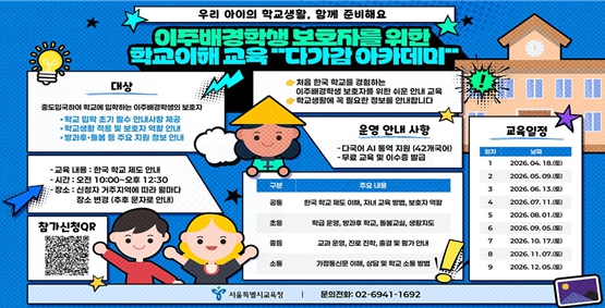 서울특별시교육청은 중도 입국, 외국인 등 이주배경을 가진 보호자들이 한국 학교 교육제도를 쉽게 이해하고, 자녀 양육에 대한 자신감을 얻어 학교와 함께 아이의 성장을 돕는 든든한 동반자가 될 수 있도록 통합 지원한다. 낯선 언어와 제도, 정보 부족 때문에 이주배경 보호자들은 자녀의 학교생활을 돕고 싶어도 실제로는 어려움을 겪는 경우가 많다. 성평등가족부의 `2024년 전국다문화가족실태조사`에 따르면, 이주배경 보호자들은 자녀 양육 시 가장 큰 어려움으로 학업‧진학‧진로 정보 부족(34.5%)과 학습지도, 학업 관리의 어려움(32.0%)을 꼽았다. 또한 출신 국가의 교육 문화 차이로 인해 학교 참여 방식에 대한 이해가 부족하거나, 자녀 교육을 학교 중심으로 인식하는 경우도 있어 학교와 가정 간 소통 지원의 필요성이 커지고 있다. 서울시교육청은 이를 단순한 보호자 개인의 문제가 아니라, 학교와 가정을 잇는 정보와 소통 지원이 부족한 구조적 문제로 보고 있다. 이에 서울시교육청은 다문화교육지원센터를 중심으로 보호자들의 정보 갈증을 해소하고 자녀교육 조력자로서의 역량을 키우기 위해 `다가감 아카데미`를 운영한다. 2026년 4월부터 12월까지 총 10회 내외로 운영되며, 매월 1회 토요일에 초‧중등 과정별로 진행된다. 학기 중 전·편입하는 학생의 보호자에게는 학교에서 필수적으로 참여를 안내하고, 그 외 희망하는 보호자들도 참여할 수 있도록 운영하여 초기 학교 적응을 지원한다. 연수의 주요내용은 △학교 교육과정 및 학사 운영 전반 이해, △ 가정에서 실천할 수 있는 학습지도와 학업 관리의 기초, △학교폭력‧아동학대 예방 등 학생 보호 및 생활 지도 이해, △학부모 의사소통‧양육 지원 및 학교‧지역 교육자원 안내로 이루어져 있다. 대면 운영 시 AI 기반 실시간 동시통역 서비스를 활용하여 다양한 언어권 보호자의 참여와 이해를 지원한다. 또한 이주배경 보호자의 자녀교육 역량 강화와 한국 교육제도에 대한 이해를 돕기 위해 총 16개 언어로 제공되는 다국어 교육정보지인 `다가감 소식지`를 매월 발간하고, 학교 현장과 가정에서 함께 활용할 수 있도록 지원한다. 학부모지원센터에서는 정서적 안정과 양육 역량 강화를 위해 `찾아가는 이주배경 학부모 마음상담`도 병행한다. 상담 접근성이 낮은 이주배경 보호자들을 위해 전문 상담사와 언어권별 통역사가 학부모 모임 현장으로 직접 찾아가 집단 상담과 코칭을 진행한다. 상담 주제는 한국 학교 운영 이해와 학부모의 역할, 자녀 정서 이해와 소통방법, 이중문화 자녀 양육 코칭 및 스트레스 관리 등 보호자들이 실제로 겪는 어려움과 고민을 반영한 맞춤형 내용으로 운영된다. 지역사회와의 밀착 지원을 위해 이주배경학생 밀집지역 교육복지센터의 이주배경학생 지원 역할도 강화한다. 용산교육복지센터는 작년 이주배경 학부모 자조모임을 통해 관계 형성을 돕고, 이력서 작성 및 일자리 찾기 등 한국 사회 안착을 위한 취업 역량 강화 교육을 단계별로 지원했다. 올해는 이주배경지원기관 협의체, 용산 아동‧청소년심리지원단, 용산 교육지원네트워크 등 지역 네트워크를 구축하여 학부모와 자녀가 함께 성장할 수 있는 기반을 마련한다. 영등포교육복지센터 역시 다문화가정 학생을 위한 학습코칭과 멘토링을 실시하여 학습지원과 정서지원을 통해 학교 적응을 돕고 있으며, 지역사회협의체에 참여하여 지역사회 정착까지 함께 지원하는 안전망을 구축하고 있다. 이 밖에도 고위험 다문화 가정 사례를 학교와 센터, 지역 기관이 협력하여 관리하는 등 학생과 보호자를 함께 지원하는 맞춤형 통합 지원 체계를 강화하고 있다. 김천홍 서울시교육감 권한대행은 “익숙하지 않은 교육환경 속에서 자녀의 학습과 진로를 지원하는데 어려움을 느껴 온 보호자들이 이러한 프로그램을 통해 학교와 더 가까이 소통하고, 자녀교육의 든든한 동반자로 자리 잡길 바란다”며, “학교와 보호자가 함께 아이를 키우는 교육 환경을 만들고, 이주배경학생의 안정적인 성장과 적응을 적극 지원하겠다”라고 밝혔다.