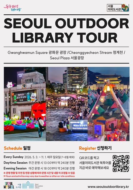 서울시는 5월 1일 서울야외도서관 `책읽는 서울광장`을 개장하고, 어린이날을 맞아 5일까지 특별 운영한다. 가족 단위 방문객을 위한 어린이날 특별 프로그램과 동대문디자인플라자(DDP) 미니 야외도서관, 외국인 대상 ‘서울야외도서관 투어’ 등으로 시민과 관광객을 맞는다. ‘책읽는 서울광장’은 서울광장에서 누구나 자유롭게 독서를 즐길 수 있도록 조성한 야외도서관으로, ‘광화문 책마당’·‘책읽는 맑은냇가’와 함께 서울야외도서관의 3개 거점 중 하나로 운영된다. 올해는 K-독서문화를 세계와 함께 나누는 글로벌 독서 명소로 한층 도약할 예정이다. 서울야외도서관 ‘광화문 책마당’과 ‘책읽는 맑은냇가’는 ‘세계 책의 날과 저작권의 날’인 오는 23일 개장하고, ‘책읽는 서울광장’은 서울광장 정비 완료 후인 5월 1일(개장한다. `책읽는 서울광장 개장 첫 주 어린이날 특별 운영…DDP에는 미니 야외도서관` ‘책읽는 서울광장’ 개장 첫 주에는 어린이날과 연계해 가족 친화형 공연·체험 프로그램을 집중 운영한다. 디지털 기기를 끄고 가족이 함께 독서에 몰입하는 ‘가족책멍’, 엄마아빠를 위한 육아 토크 콘서트, 각종 공연·레크리에이션 프로그램 등을 통해 어린이날 연휴를 풍성하게 채울 예정이다. 3일 김한별 아나운서가 진행하는 ‘가족책멍’ 프로그램과 아빠들의 육아일기책 『썬데이 파더스 클럽』의 강혁진 작가가 참여하는 육아 토크 콘서트가 열린다. 4일에는 ‘청춘유수 포에니스’의 전통악기와 클래식이 결합된 공연이 진행되며, ‘2026 볼로냐 라가치상’ 크로스미디어 부문 ‘스페셜 멘션’수상작인 그림책 프로젝트 ‘상상금지!’가 KT키즈랜드 제공으로 상영된다. 어린이날인 5일(화)에는 금가루예술단 김유진이 진행하는 레크리에이션을 시작으로, 마술 공연 ‘오즈의 신기한 마법도서관’, ‘와이즈 발레단’ 발레 공연, 크로스오버 밴드 ‘두 번째 달’의 공연, 우리나라 마리오네트 인형극 장르를 개척한 마리오네트 명인 ‘옥종근’의 인형극도 이어진다. 또한 한국출판문화산업진흥원과 협력해 2025년 픽션 부문 대상『점과 선과 새』등 대한민국 그림책상 수상작도 전시한다. 특히 3일 진행되는『썬데이 파더스 클럽』북토크는 예비부모를 대상으로 책상자를 보내 가정 내 독서환경을 조성하는 ‘엄마북(Book)돋움’ 사업과 연계한 프로그램으로, 5월 가정의 달을 맞아 가족과 육아를 주제로 부모들의 양육 경험과 고민을 공유하고 공감대를 형성할 수 있게 마련됐다. ‘엄마북돋움’ 사업은 예비부모 및 영유아 가정을 대상으로 그림책 2권·양육 도서 1권·서울시 육아정책 정보를 담은 ‘책꾸러미’를 지원하는 사업이다. 부모의 양육 불안감을 낮추고 예비부모와 태어날 아기를 대상으로 가정내 독서 활성화를 유도하며, 지난해 참여자 종합 만족도 97.8%를 기록하는 등 높은 호응을 얻고 있다. 이날 ‘엄마북돋움’ 경험 부스에서 2026년 엄마아빠책, 아기책 전시와 매월 진행되는 육아강연 ‘월간 북돋움’도 안내된다. 또한 ‘우리 가족 책 읽기 숏폼 공모전’에 참여할 수 있고, 아이와 함께 특별한 순간을 기록할 수 있는 포토부스도 운영된다. 개장 주간에는 다양한 참여형 이벤트도 진행된다. 책 사이에 숨겨진 티켓을 찾으면 솜사탕을 증정하는 ‘빼꼼 책광장 티켓’과 매일 오후(17시 40분~18시) 하루의 끝에 선물을 안겨주는 ‘깜짝 추첨 티켓’ 이벤트를 통해 현장에 재미를 더할 예정이다. 한편 더 많은 시민이 야외도서관을 경험할 수 있도록 2일부터 5일까지 동대문디자인플라자(DDP) 잔디마당에서 ‘미니 야외도서관’을 특별 운영한다. 팽이의자, 팝업 북키트, ‘책읽는 서울광장’ 시그니처 소파와 책바구니 등으로 조성된 공간에서 색다른 독서 경험을 즐길 수 있다. DDP 봄맞이 축제와 연계한 이번 미니 야외도서관은 약 2,000㎡ 규모 공간에 ▲독서 쉼터 ZONE(존) ▲독서 피크닉 ZONE(존) ▲전시 ZONE(존) 등으로 조성된다.`외국인 대상 ‘서울야외도서관 투어’ 본격 운영…도심 속 ‘K-독서문화’ 세계에 선보여` 5월부터는 외국인 관광객을 대상으로 ‘서울야외도서관 투어(Seoul Outdoor Library Tour)’를 본격 추진한다. 서울야외도서관 3개 거점을 연결한 체험형 콘텐츠로, 도보로 이동하며 각 공간의 특색을 살린 독서 콘텐츠를 경험할 수 있도록 구성됐다. 매주 일요일 회차당 외국인 관광객 약 20명 규모로 운영되며, 약 240분 동안 오리엔테이션·3개 거점 이동 및 거점별 체험·소감 공유까지 단순 관람이 아닌 서울야외도서관만의 특별한 독서 경험 중심으로 운영된다. 참여자는 ‘광화문 책마당’ 독서 라운지에서 몰입형 독서와 독서등 만들기 체험을 시작으로, ‘책읽는 맑은냇가’에서 헤드폰을 활용한 오디오북 프로그램을 통해 걷기와 독서를 결합한 체험, ‘책읽는 서울광장’에서는 잔디 위 자유롭게 책을 읽는 ‘힙한 책멍’까지 도심 속에서의 색다른 독서 경험을 하게 된다. 또한 투어 참가자들에게는 한국문학번역원과 협력하여 번역원에서 발행하는 한국문학 해외 소개 영문 계간지『Korean Literature Now (KLN)』를 제공해 우수한 한국문학을 해외에 알리는