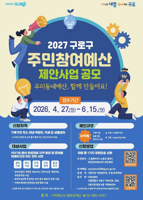 구로구가 2027년 예산에 편성할 ‘주민참여예산 사업 공모’를 4월 27일부터 6월 15일까지 진행한다. 주민참여예산제는 주민이 실생활에 필요한 사업을 직접 제안하고 구가 이를 예산에 반영하는 제도로 공모 접수 후 최종 선정되는 사업은 내년도 예산에 반영된다.이번 주민참여예산 사업 규모는 총 20억원으로 대상은 구로구 내 지역문제를 해결하기 위한 사업 또는 지역 발전을 위한 모든 사업으로 사업 범위에 따라 구 공통사업과 동 지역사업으로 구분된다.구 공통사업은 구정 전반 또는 2개 동 이상에 걸친 사업으로 일반사업의 경우 1.5억원 이하, 프로그램(행사성) 사업은 1,500만원 이하의 사업을 제안할 수 있다.동 지역사업은 단일 동의 현안 사업 또는 동별 특성화 사업을 대상으로 하며, 동별 총 4,500만원의 예산액이 배정된다. 구로구 주민뿐만 아니라 구 내 직장인 또는 학생 등 구로구 생활권자라면 누구나 자유롭게 참여할 수 있으며, 신청은 6월 15일까지 구로구청 누리집, 이메일, 우편, 방문 등을 통해 가능하다.구로구는 접수된 제안사업의 타당성 등을 검토한 뒤, 주민참여예산위원회의 심사와 9월 주민투표 등을 거쳐 오는 10월 개최되는 총회에서 최종 편성 사업을 선정할 계획이다.구로구 관계자는 “주민참여예산을 활성화해 주민과 함께 구정을 만들어 나갈 것”이라며 “우리 구에 꼭 필요한 사업이 발굴될 수 있도록 많은 참여를 부탁드린다”고 말했다.한편, 구로구는 지난해 주민참여예산 사업으로 접수된 181건의 제안 중 64개 사업, 총 20여억원을 올해 예산에 반영해 추진하고 있다.