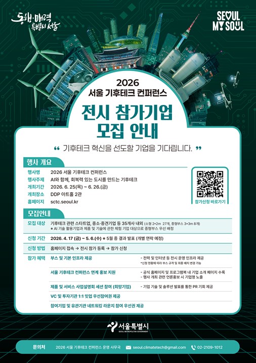 서울시는 4월 17일부터 5월 6일까지 ‘2026 기후테크 컨퍼런스’ 참여할 혁신 기업을 모집한다. “AI와 함께, 회복력 있는 도시를 만드는 기후테크”를 주제로 열리는 이번 행사는 환경의 달을 맞아 6월 25일~26일 이틀간 DDP 아트홀 2관에서 개최된다. 행사는 국내외 기후테크 전문가들이 참여하는 기후테크 컨퍼런스, 혁신기업 기술을 한눈에 볼 수 있는 기술 전시, 기업과 투자사가 만나는 1:1 투자상담 등으로 채워진다. 모집 대상은 기후테크 기술을 보유한 스타트업, 중소·중견기업으로, 총 35개 사 내외를 선정할 계획이다. 특히 AI 기술을 적용하여 온실가스 감축과 기후변화 적응에 기여하는 기업, 시민 체험과 시연 요소가 풍부한 기업을 우대한다. 선정 기업에는 전시 공간 제공, 기술 홍보 지원, 제품·서비스 설명회(IR피칭) 기회, 투자사와의 1:1 상담 등 실질적인 성장 지원이 제공된다. 현장에서는 참여 기관 간 교류를 촉진하는 ‘네트워킹 라운지’가 DDP 비즈니스라운지에 마련되며, 행사 참여 기관에 참석 우선권이 주어진다. 시는 이번 행사가 시민들에게는 AI와 기후테크 융합을 체험하는 장으로, 기업에는 기술·제품 홍보와 투자 네트워킹의 기회로, 정책·연구기관에는 AI시대 기후변화 대응 전략를 모색하는 논의의 장이 될 것으로 기대하고 있다. ‘서울 기후테크 컨퍼런스’는 2023년 지자체 최초로 서울시가 시작한 기후테크 관련 행사로, 지난해에는 스마트라이크위크(SLW)와 연계해 코엑스에서 사흘간 열리며 약 6만여 명이 찾는 등 높은 관심을 모았다. 참여 신청은 ‘2026 서울 기후테크 컨퍼런스’ 누리집에서 가능하며, 전시 참여와 관계없이 투자 상담은 상시 접수한다. 최종 선정 결과는 5월 중 개별 통보되며, 자세한 내용은 누리집이나 운영 사무국을 통해 확인할 수 있다. 권 민 서울시 기후환경본부장은 “기후변화 대응도 AI 발전으로 패러다임 전환을 맞이하는 중요한 시기”라며, “혁신 기술 보유 기업들의 많은 참여를 바라며, 서울시는 기후테크 생태계 조성과 산업 발전을 적극 지원해 나가겠다”고 말했다.
