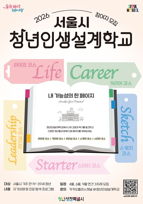 서울시는 올해 9년차를 맞은 청년인생설계학교가 2026년 새로운 입학생을 모집한다고 밝혔다. 청년인생설계학교는 진로 탐색부터 커리어 재설계까지, 인생의 전환점을 맞이한 청년들이 자기 이해를 바탕으로 진로 방향을 설정할 수 있도록 지원하는 서울시 대표 청년정책이다. 진단검사, 전문 코칭, 실습 교육을 통해 자신의 강점을 찾고, 구체적인 진로를 설계할 수 있도록 지원해 참여자 만족도가 높다. 2025년 종합 만족도는 4.63점(5점 만점)을 기록했으며, 자기효능감‧삶의 만족도 등 긍정적 자기 인식 지표는 평균 16% 향상된 것으로 나타났다. 2026년 청년인생설계학교는 1기 4월, 2기 6월, 3기 9월 세 차례에 걸쳐 참여자를 모집한다. 자기 주도적인 진로 탐색과 인생 설계에 관심 있는 19~39세 청년이라면 누구나 신청할 수 있다. 참여자들은 진로 탐색 단계나 고민 유형에 따라 4개 코스 중 원하는 코스별 프로그램을 선택할 수 있다. 예비청년 특화과정인 스타터 코스는 대상 특성을 고려하여 대학수학능력시험일 이후 기수 외로 프로그램을 운영할 계획이다. 1기에는 라이프(140명), 커리어(180명), 리더십(60명), 스케치(15명) 총 4개 코스를 운영한다. 1기 참여를 희망하는 청년은 4월 27일 오전 10시부터 5월 18일 오후 17시까지 청년 몽땅 정보통에서 온라인으로 신청하면 된다. 라이프‧커리어‧리더십 코스는 19~39세 서울 거주 청년 누구나 신청할 수 있다. 의무복무 제대군인은 복무기간에 따라 최대 42세까지 신청이 가능하다. 대학 비진학 청년 특화과정인 스케치 코스의 경우 서울에 거주하는 19~29세 대학 비진학 청년을 대상으로 한다. 마찬가지로 의무복무 제대군인의 경우 복무기간에 따라 참여 기간이 최대 3년까지 연장되어, 32세까지 신청할 수 있다. 시는 사회적 배려가 필요한 청년의 참여 기회를 보장하기 위해 정원의 50%를 우선 선정할 계획이다. 우선선정 대상은 기준 중위소득 100% 이하 가구, 자립준비청년, 가족돌봄청년 등이며 세부 기준은 청년 몽땅 정보통 누리집 내 공지사항에서 확인할 수 있다. 1기 프로그램은 6월 8일부터 7월 11일까지 5주간 주 1회, 서울광역청년센터와 자치구별 서울청년센터 등 청년 생활권 거점에서 운영된다. 전 과정은 무료로 제공되며, 4회 이상 참여 시 서울시장 명의의 수료증이 발급된다. 김철희 서울시 미래청년기획관은 “청년인생설계학교는 청년이 자신의 강점을 발견하고 삶의 방향을 구체화할 수 있도록 돕는 프로그램”이라며 “앞으로도 청년이 스스로 미래를 설계할 수 있도록 체감도 높은 지원을 지속해 나가겠다”고 말했다.