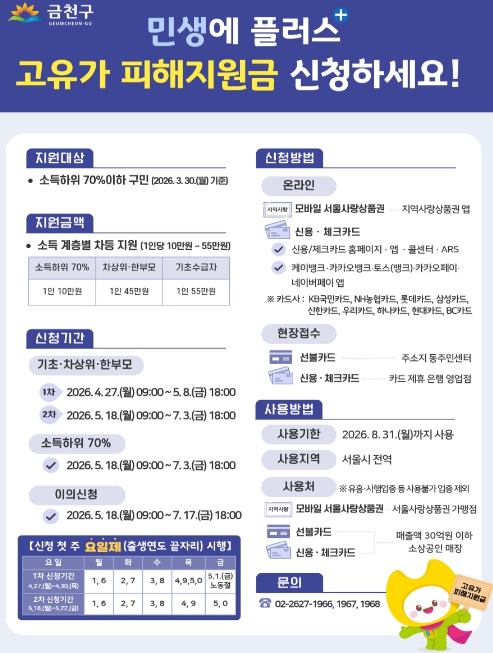 금천구는 중동 정세 불안 등으로 촉발된 고유가·고환율·고물가 상황에서 구민의 생활 부담을 완화하고 지역경제를 활성화하기 위해 오는 27일부터 ‘1차 고유가 피해지원금’ 신청 접수 및 지급을 시작한다고 밝혔다.1차 고유가 피해지원금을 지급받는 대상은 관내 거주하는 기초생활수급자, 차상위계층, 한부모가족 등 취약계층이다. 지원 금액은 기초생활수급자는 1인당 55만 원, 차상위계층과 한부모가족은 45만 원 등이다.오는 27일부터 5월 8일까지 2주간 온라인과 오프라인으로 1차 고유가 피해지원금 지급을 신청하면 된다.온라인 신청은 카드사 홈페이지·앱·콜센터·ARS를 비롯해 카카오뱅크, 토스(뱅크), 케이뱅크 등 인터넷은행과 카카오페이, 네이버페이 등 간편결제 앱, 서울페이플러스(pay+) 앱을 통해 가능하다. 오프라인 신청은 동 주민센터와 카드사 연계 은행 영업점에서 할 수 있다.신청 첫째 주인 27~30일에는 접수 창구 혼잡을 방지하기 위해 출생연도 끝자리를 기준으로 요일제가 적용된다. 월요일(끝자리 1, 6), 화요일(2, 7), 수요일(3, 8), 목요일(4, 9, 5, 0) 순으로 신청할 수 있다. 이후 요일제는 해제된다.다만 5월 1일(노동절)에는 동 주민센터 방문 접수는 시행하지 않으며, 온라인 신청은 가능하다.고유가 피해지원금은 지역 내 소비 촉진과 소상공인 지원을 위해 서울시 내 가맹점에서 사용할 수 있다. 연 매출 30억 원 이하 소상공인 업종에서 사용할 수 있으며, 유흥·사행업종 및 대형마트 등 일부 업종은 제외된다. 사용 기한은 8월 31일까지다.이에 구는 원활한 고유가 피해지원금 지급 추진을 위한 전담 태스크포스(TF)를 구성했다. 시스템 및 인력 준비 상황을 점검하는 한편, 동주민센터 안내 체계 강화와 대상자 안내문 발송 등 사전 홍보에도 만전을 기하고 있다.취약계층을 대상으로 한 1차 고유가 피해지원금 지급에 이어 일반 구민(소득 하위 70%)을 대상으로 하는 2차 고유가 피해지원금은 오는 5월 18일부터 지급될 예정이다. 구는 행정안전부의 대상자 명단이 확정되는 대로 세부 지급 계획을 별도로 안내할 계획이다.아울러 1차 지급 대상자 중 신청 기간 내 신청하지 못한 경우에는 2차 신청 기간에 신청하면 된다.구 관계자는 “급격한 물가 상승으로 어려움을 겪는 취약계층에게 이번 지원금이 실질적인 도움이 되길 바란다”라며 “구민 한 분도 빠짐없이 기한 내 지원금을 받을 수 있도록 신속하고 빈틈없는 집행에 최선을 다하겠다”라고 밝혔다.