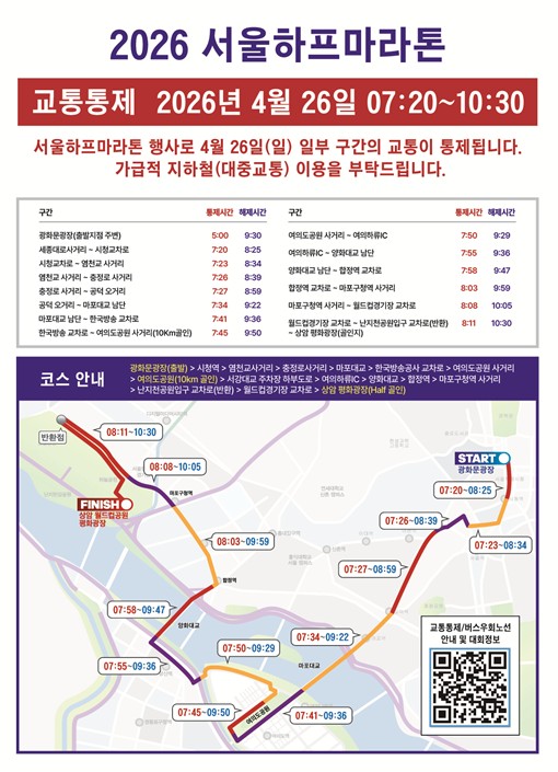 서울시는 4월 26일 오전 7시 30분 광화문광장을 출발해 여의도공원과 상암 월드컵공원으로 이어지는 ‘2026 서울하프마라톤대회’를 개최한다. 올해로 10회를 맞는 서울하프마라톤은 서울시, ㈜조선일보사, 서울특별시체육회가 공동 주최하며, 국내 하프 마라톤 대회 중 최대 규모로 하프코스와 10km 코스에 총 2만 2천 명이 참가한다. 서울하프마라톤 코스는 도심과 한강을 잇는 서울의 상징적인 마라톤 코스로 4월의 봄 정취를 만끽할 수 있는 코스이다. 참가자들은 광화문광장을 출발해 마포대교, 양화대교 등을 지나 각각 여의도공원(10km), 상암 평화광장(하프)에 도착한다. 대회 당일 오전 7시 20분부터 10시 30분까지 마라톤 코스에 포함된 도심 주요 도로는 순차적으로 교통 통제되고 시는 참가자 통과 이후 즉시 해제하는 탄력적 통제 방식을 적용해 시민 불편을 최소화할 계획이다. 서울시는 교통 통제로 인한 시민 불편을 줄이기 위해 출발 및 해제 시각을 지난해보다 각각 30분 앞당겼으며 전 구간 교통 통제는 10시 30분 이전 해제할 예정이다. 주요 통제구간은 광화문광장, 세종대로, 마포대로, 마포대교, 여의대로, 국회대로, 양화대교, 합정역, 마포구청역, 월드컵로 일부 구간 등이며, 구간별로 마라톤 통과 시간에 맞춰 구간별 약 1시간에서 2시간 30분 내외로 통제가 이뤄진다. 아울러 서울시는 대회 전 시민 대상 사전 안내 문자를 발송하고, 서울시와 ㈜조선일보사, 서울특별시체육회의 주요 매체를 활용하여 교통 통제와 관련한 정보를 적극 제공할 예정이다. 대회 당일에는 원활한 교통 흐름을 위해 주요 구간에 교통경찰과 안내요원을 배치하고 실시간 교통정보를 제공하는 등 현장 관리를 강화한다. 또한 주요 지점에 상황실과 의료 부스를 설치하고 코스 내 70여 명의 레이스페트롤을 비롯해, 1,800여 명의 운영 인력을 투입하여 대회 참가자 안전 확보에 만전을 기할 계획이다. 서울시는 대회를 앞두고 시민들에게 해당 시간대 자가용 이용을 자제하고 지하철 등 대중교통을 이용을 적극 당부하는 한편 참가자와 응원단에게는 코스 주변 주민들을 위해 과도한 소음이나 도구를 이용한 응원을 자제해 줄 것을 요청했다. 김명주 서울시 관광체육국장은 “올해로 10회를 맞는 서울하프마라톤은 시민과 함께하는 대표 도심 마라톤 행사로 봄기운이 완연한 도심 속에서 활력을 더하는 축제”라며 “대회 당일 일부 도로의 불가피한 교통 통제가 이루어지는 만큼 시민 여러분의 너그러운 양해와 적극적인 협조를 부탁드린다”라고 말했다.